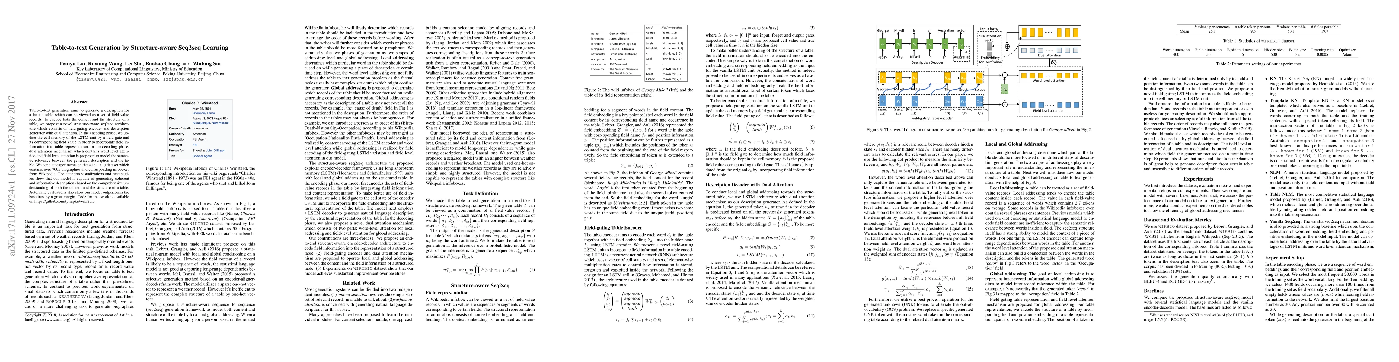 This paper proposes a structure-aware seq2seq model for table-to-text generation, incorporating both content and structure through a field-gating encoder and dual attention mechanism. Experiments on the WIKIBIO dataset demonstrate its superior performance and ability to generate coherent, informative descriptions.
