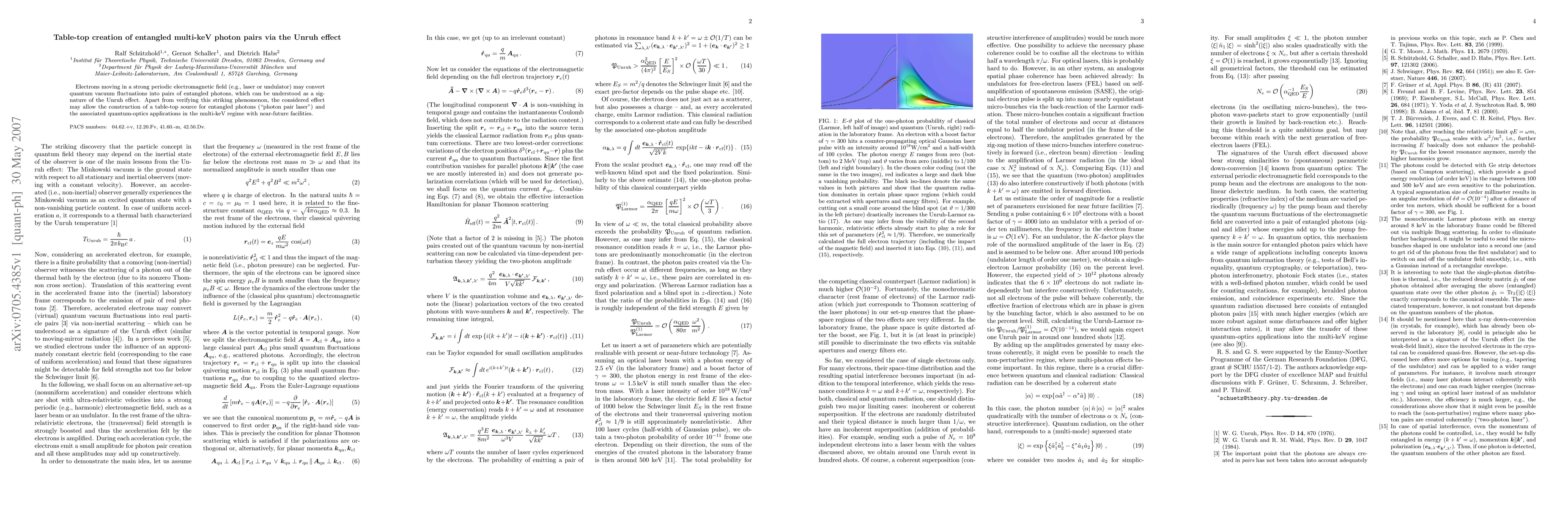 This paper demonstrates the creation of entangled multi-keV photon pairs via the Unruh effect, where electrons in a strong periodic electromagnetic field convert quantum vacuum fluctuations into photon pairs. This discovery could lead to the development of a table-top source for entangled photons, enabling advanced quantum-optics applications in the multi-keV regime.