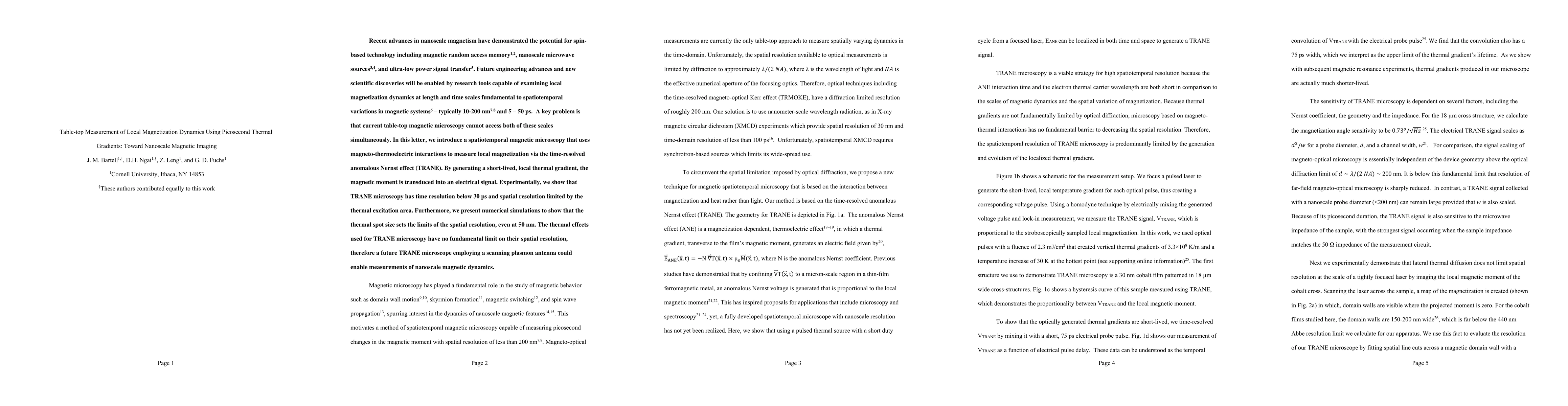 This paper introduces a novel spatiotemporal magnetic microscopy technique using the time-resolved anomalous Nernst effect (TRANE) to measure local magnetization dynamics at nanoscale length and picosecond time scales. The method employs picosecond thermal gradients to convert magnetic moments into electrical signals, achieving time resolution below 30 ps and spatial resolution limited by the thermal excitation area.