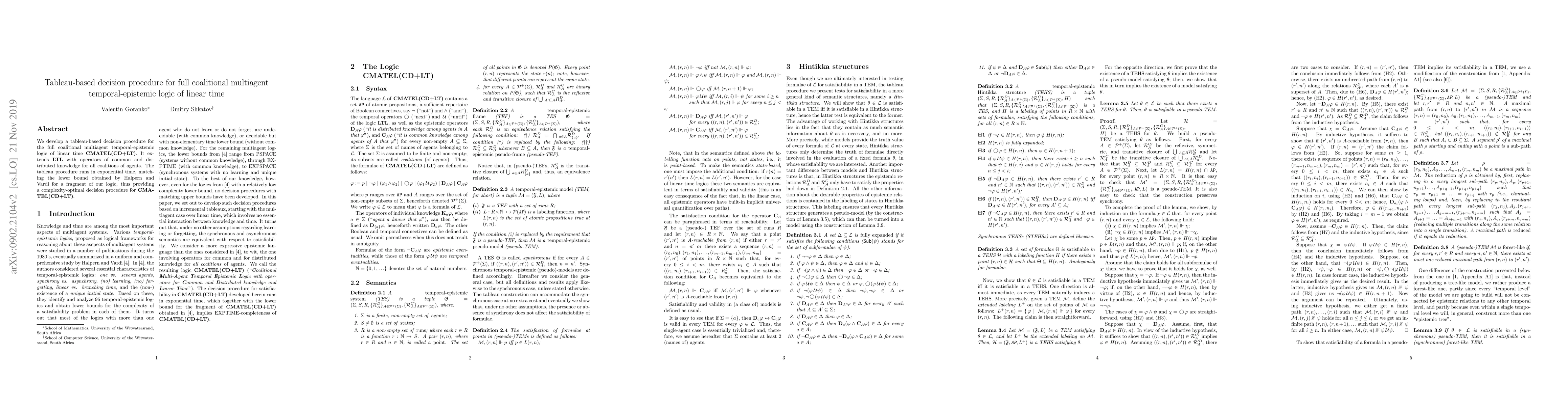 We develop a tableau-based decision procedure for the full coalitional multiagent temporal-epistemic logic of linear time CMATEL(CD+LT). It extends LTL with operators of common and distributed knowledge for all coalitions of agents. The tableau procedure runs in exponential time, matching the lower bound obtained by Halpern and Vardi for a fragment of our logic, thus providing a complexity-optimal decision procedure for CMATEL(CD+LT).