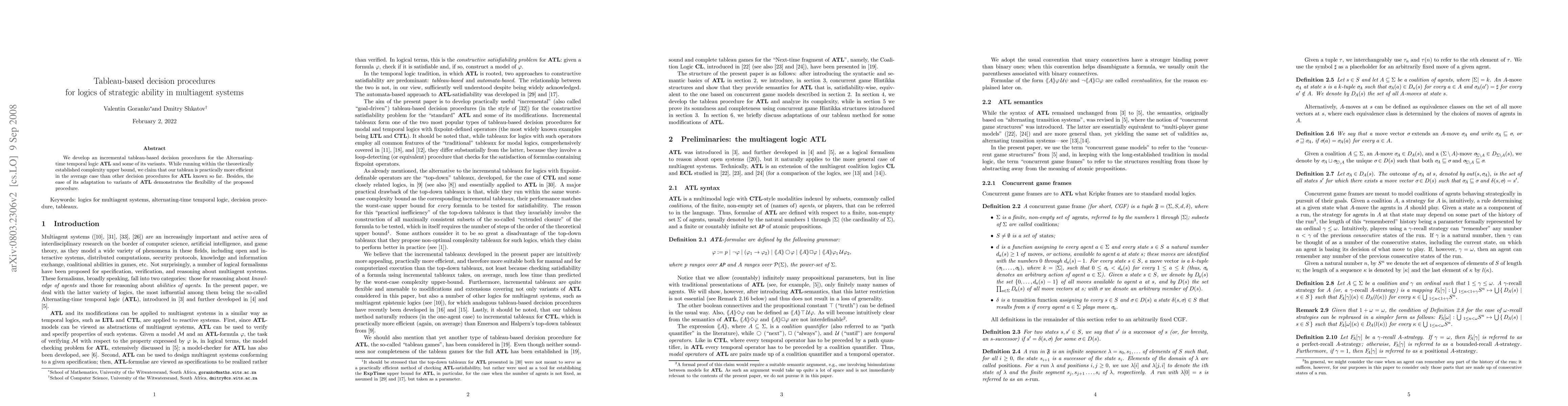 This paper introduces an incremental tableau-based decision procedure for Alternating-time temporal logic (ATL) and its variants, claiming practical efficiency and flexibility over existing methods while maintaining theoretical complexity bounds. The proposed method's adaptability highlights its broad applicability in multi-agent systems.