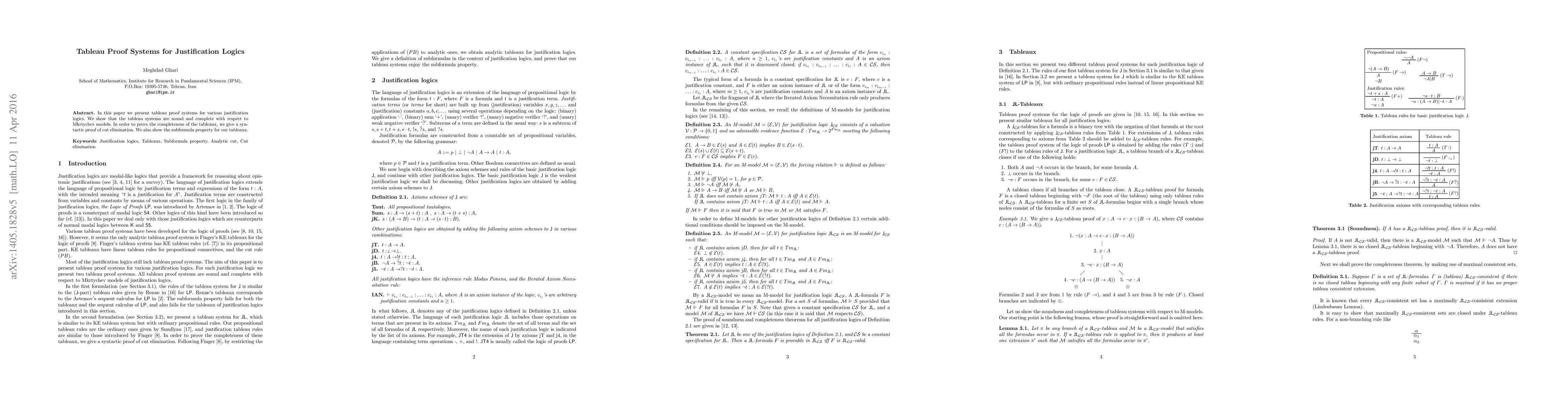 This paper introduces tableau proof systems for different justification logics, demonstrating their soundness and completeness relative to Mkrtychev models. The authors provide a syntactic proof of cut elimination to establish completeness and show the subformula property for the developed tableaux.