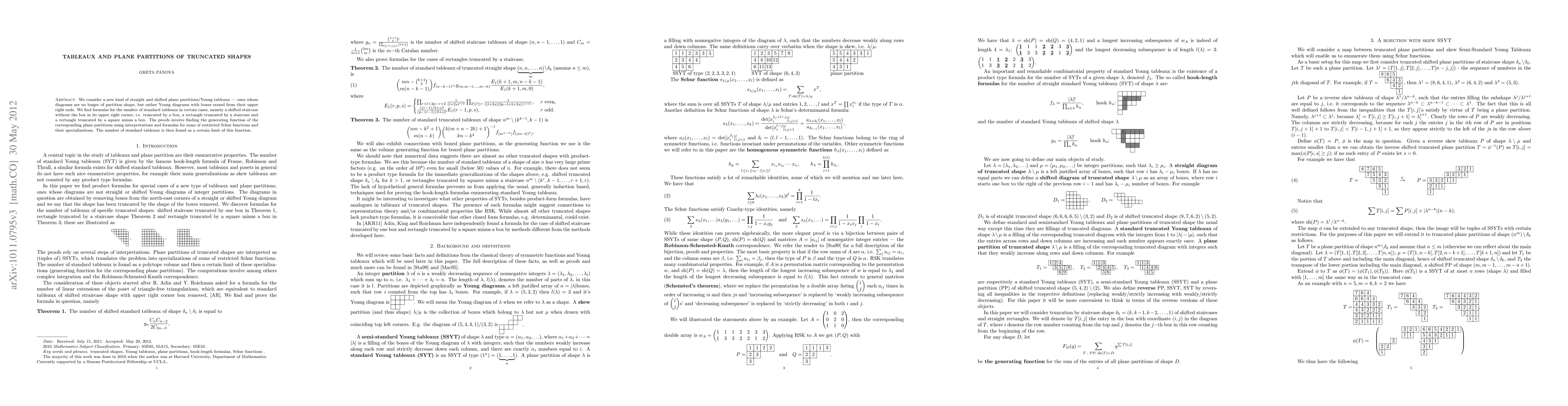 This paper explores new types of shifted plane partitions and Young tableaux formed by truncating standard shapes, deriving formulas for the number of standard tableaux in specific truncated cases. The proofs utilize generating functions and restricted Schur functions to determine the limits corresponding to these truncated shapes.