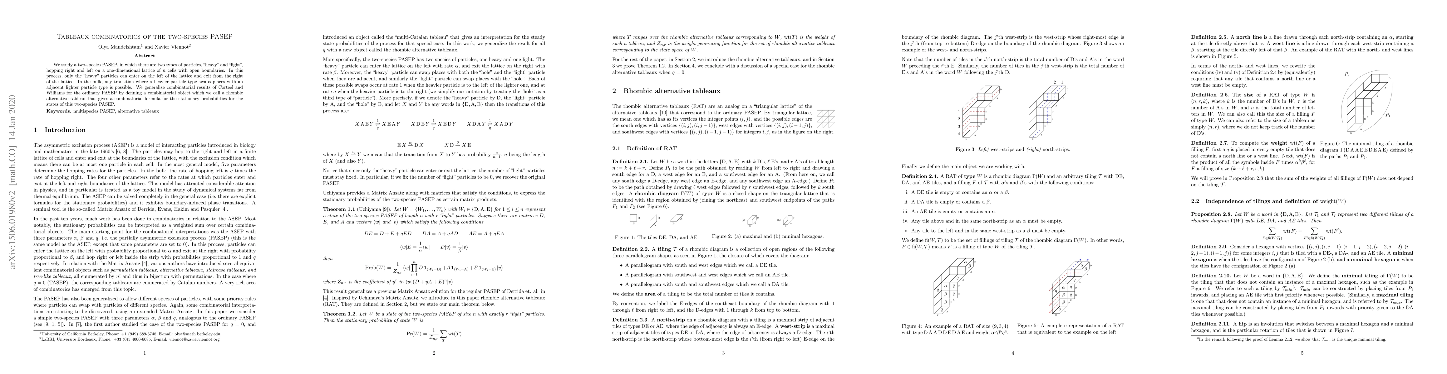 We study a two-species PASEP, in which there are two types of particles, "heavy" and "light," hopping right and left on a one-dimensional lattice of $n$ cells with open boundaries. In this process, only the "heavy" particles can enter on the left of the lattice and exit from the right of the lattice. In the bulk, any transition where a heavier particle type swaps places with an adjacent lighter particle type is possible. We generalize combinatorial results of Corteel and Williams for the ordinary PASEP by defining a combinatorial object which we call a rhombic alternative tableau that gives a combinatorial formula for the stationary probabilities for the states of this two-species PASEP.