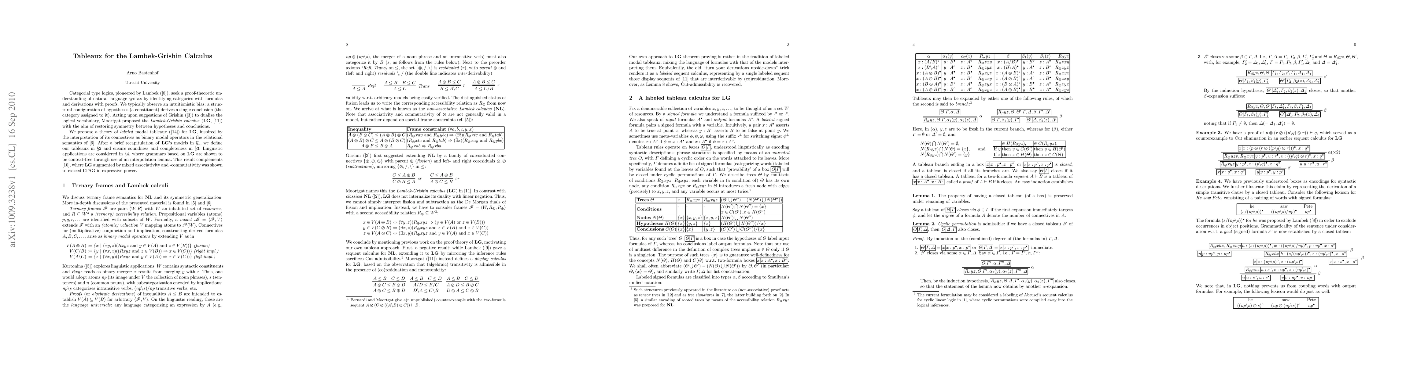 Categorial type logics, pioneered by Lambek, seek a proof-theoretic understanding of natural language syntax by identifying categories with formulas and derivations with proofs. We typically observe an intuitionistic bias: a structural configuration of hypotheses (a constituent) derives a single conclusion (the category assigned to it). Acting upon suggestions of Grishin to dualize the logical vocabulary, Moortgat proposed the Lambek-Grishin calculus (LG) with the aim of restoring symmetry between hypotheses and conclusions. We develop a theory of labeled modal tableaux for LG, inspired by the interpretation of its connectives as binary modal operators in the relational semantics of Kurtonina and Moortgat. As a linguistic application of our method, we show that grammars based on LG are context-free through use of an interpolation lemma. This result complements that of Melissen, who proved that LG augmented by mixed associativity and -commutativity was exceeds LTAG in expressive power.