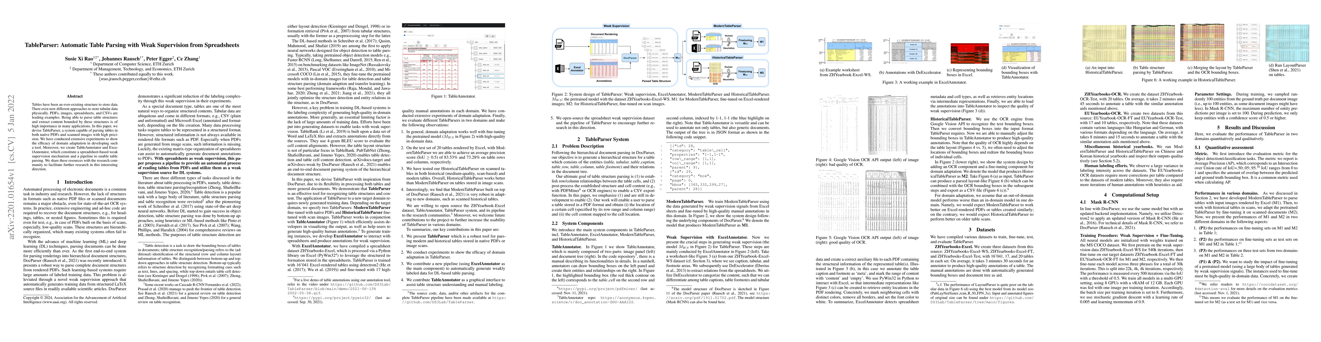 TableParser is a system designed for automatic table parsing from PDFs and scanned images, leveraging weak supervision from spreadsheets. The paper also introduces TableAnnotator and ExcelAnnotator, tools that facilitate domain adaptation and provide a weak supervision mechanism for improved parsing accuracy.