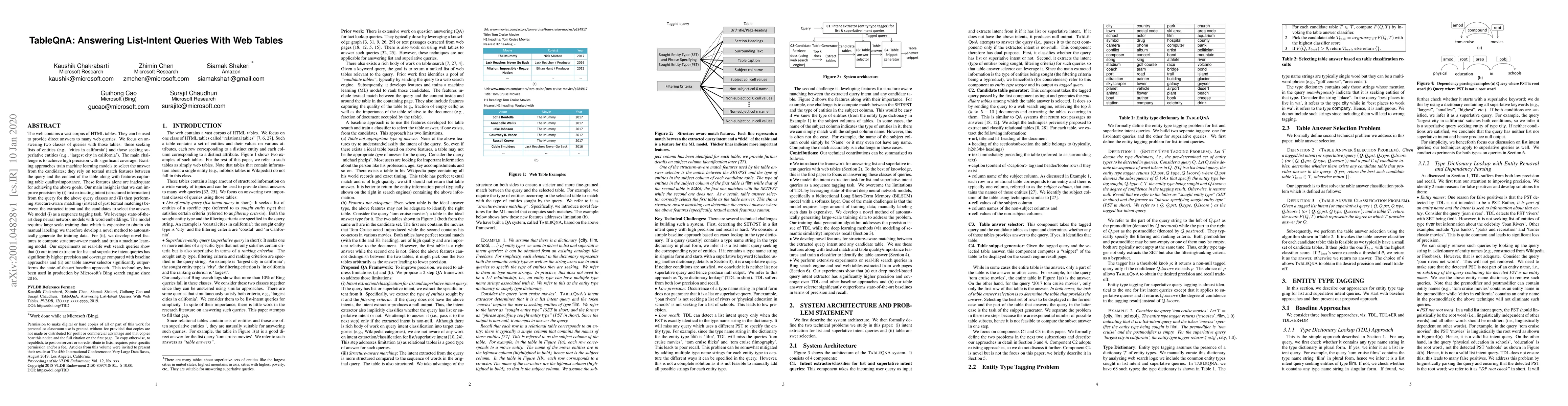 This paper presents a method for improving the precision and coverage of web table-based answers to list and superlative intent queries by extracting query intent and performing structure-aware matching. The approach leverages deep neural networks and automatically generated training data, outperforming existing models and being implemented in Microsoft's Bing search engine.