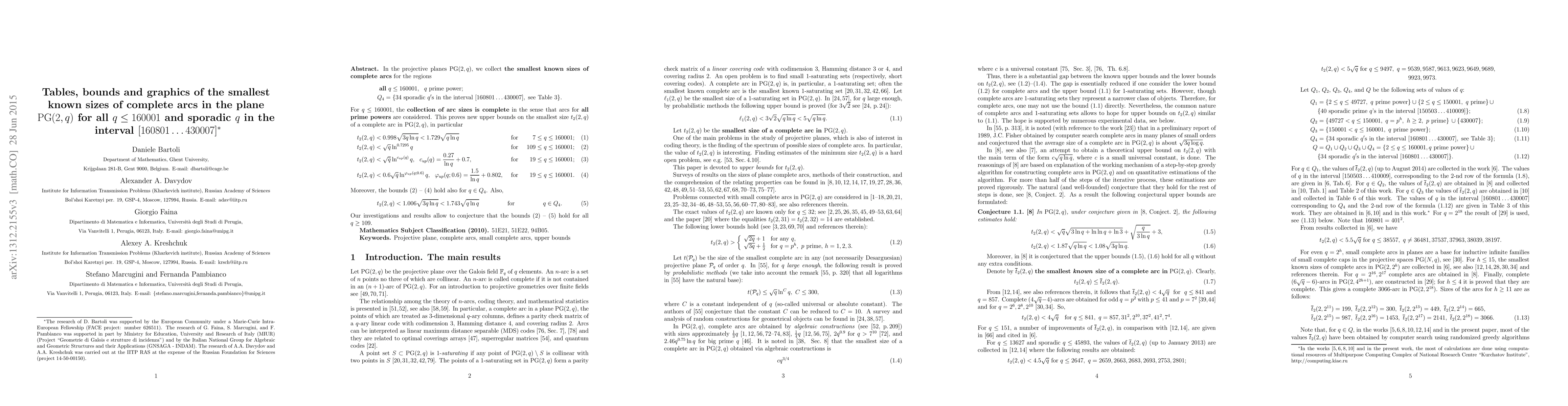 In the projective planes $\mathrm{PG}(2,q)$, we collect the smallest known sizes of complete arcs for the regions \begin{align*} &\mbox{all } q\le160001,~~ q \mbox{ prime power};\\ &Q_{4}=\{34 \mbox{ sporadic }q'\mbox{s in the interval }[160801\ldots430007], \mbox{ see Table 3}\}. \end{align*} For $q\le160001$, the collection of arc sizes is complete in the sense that arcs for all prime powers are considered. This proves new upper bounds on the smallest size $t_{2}(2,q)$ of a complete arc in $\mathrm{PG}(2,q)$, in particular \begin{align*} t_{2}(2,q)&<0.998\sqrt{3q\ln q}<1.729\sqrt{q\ln q}&\mbox{ for }&&7&\le q\le160001;~~(1) \\ t_{2}(2,q)&<\sqrt{q}\ln^{0.7295}q&\mbox{ for }&&109&\le q\le160001;~~(2)\\ t_{2}(2,q)&<\sqrt{q}\ln^{c_{up}(q)}q,~~c_{up}(q)=\frac{0.27}{\ln q}+0.7,&\mbox{ for }&&19&\le q\le160001;~~(3)\\ t_{2}(2,q)&<0.6\sqrt{q}\ln^{\varphi_{up}(q;0.6)} q,~~\varphi_{up}(q;0.6)=\frac{1.5}{\ln q}+0.802,&\mbox{ for }&&19&\le q\le160001.~~(4) \end{align*} Moreover, the bounds (2) -- (4) hold also for $q\in Q_{4}$. Also, \begin{align*} t_{2}(2,q)&<1.006\sqrt{3q\ln q}<1.743\sqrt{q\ln q}&\mbox{ for }&&q\in Q_{4}.~~(5) \end{align*} Our investigations and results allow to conjecture that the bounds (2) -- (5) hold for all $q\geq109$.