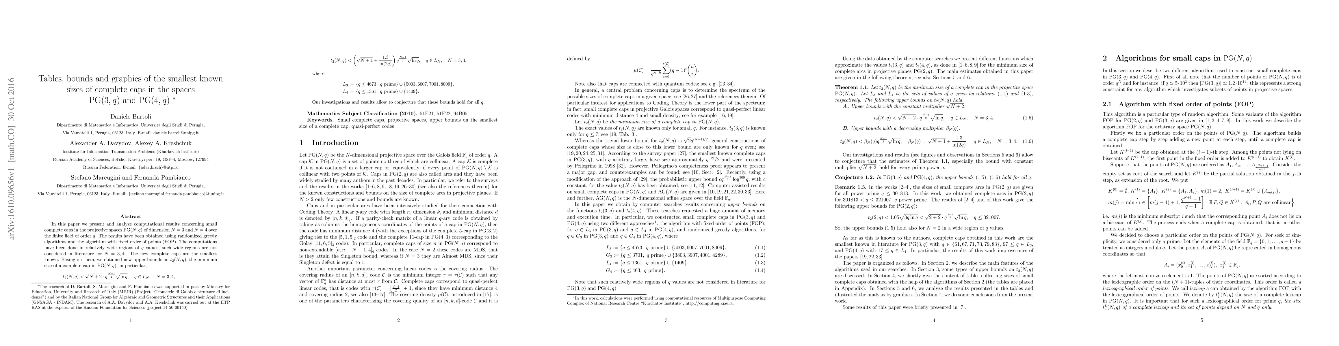 In this paper we present and analyze computational results concerning small complete caps in the projective spaces $\mathrm{PG}(N,q)$ of dimension $N=3$ and $N=4$ over the finite field of order $q$. The results have been obtained using randomized greedy algorithms and the algorithm with fixed order of points (FOP). The computations have been done in relatively wide regions of $q$ values; such wide regions are not considered in literature for $N=3,4$. The new complete caps are the smallest known. Basing on them, we obtained new upper bounds on $t_2(N,q)$, the minimum size of a complete cap in $\mathrm{PG}(N,q)$, in particular, \begin{align*} &t_{2}(N,q)<\sqrt{N+2}\cdot q^{\frac{N-1}{2^{\vphantom{H}}}}\sqrt{\ln q},\quad q\in L_{N},\quad N=3,4,\\ &t_{2}(N,q)<\left(\sqrt{N+1}+\frac{1.3}{\ln (2q)}\right)q^{\frac{N-1}{2^{\vphantom{H}}}}\sqrt{\ln q},\quad q\in L_{N},\quad N=3,4, \end{align*} where \begin{align*} &L_{3}:=\{q\le 4673, ~q\ \textrm{prime}\} \cup \{5003,6007,7001,8009\},\\ &L_{4}:=\{q\le 1361, ~q\ \textrm{prime}\} \cup \{1409\}. \end{align*} Our investigations and results allow to conjecture that these bounds hold for all $q$.