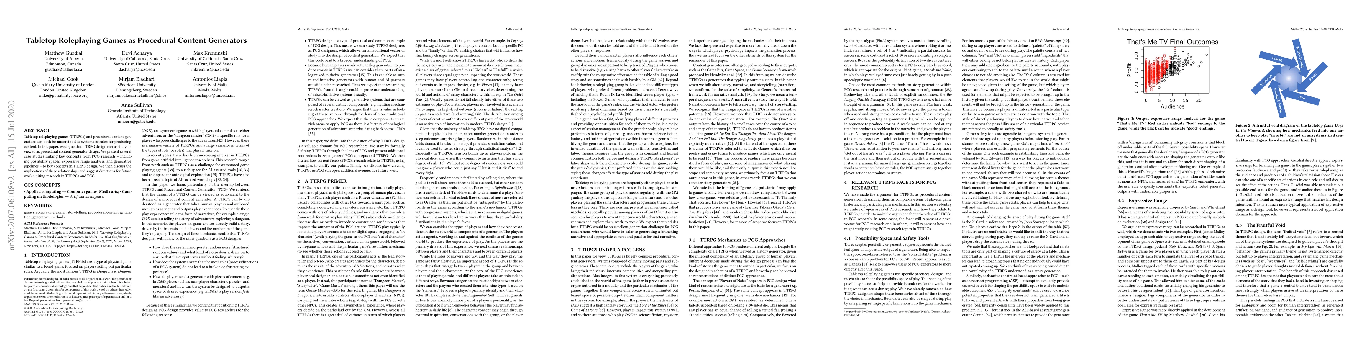 This paper explores tabletop roleplaying games (TTRPGs) as analogous to procedural content generators (PCGs), highlighting shared concepts like possibility spaces and generative pipelines. It suggests potential for future research to bridge TTRPG design and PCG methodologies.