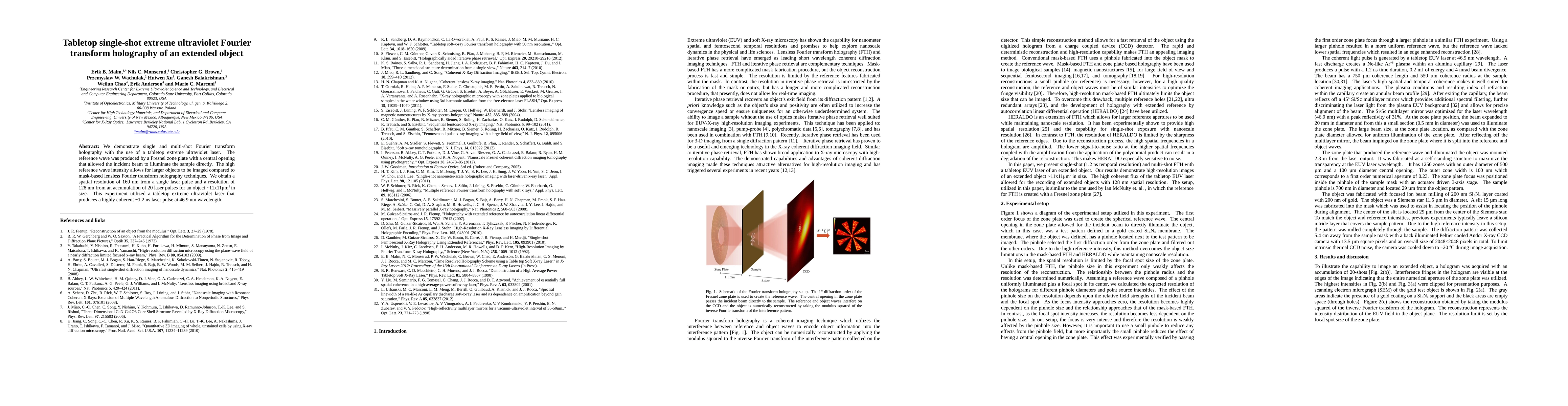 This paper demonstrates tabletop extreme ultraviolet Fourier transform holography using a coherent laser pulse, achieving a spatial resolution of 169 nm from a single shot and 128 nm from 20 shots, allowing imaging of larger objects compared to traditional lensless techniques.