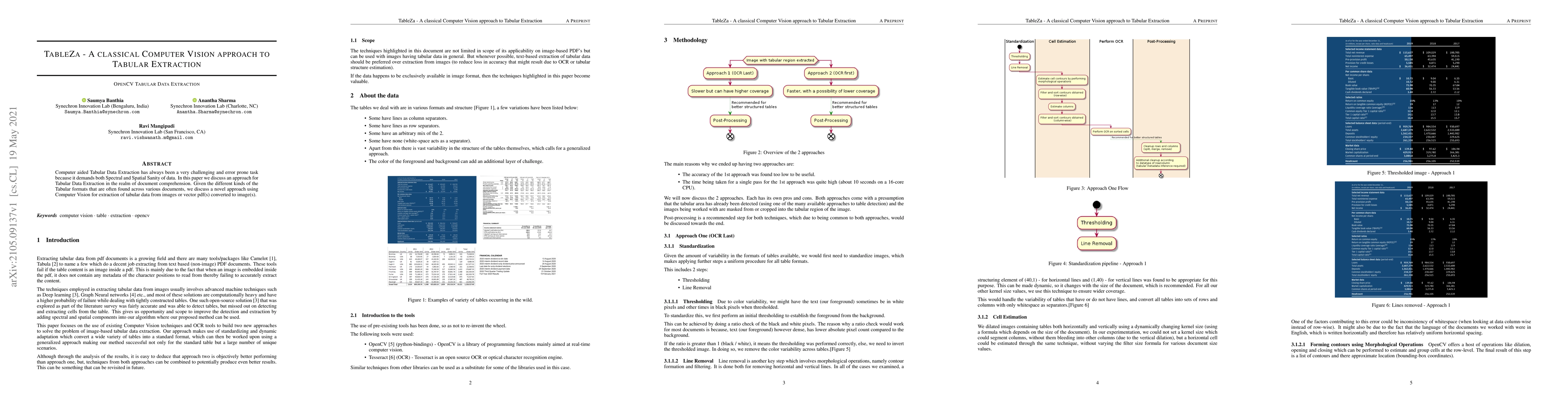 Title: TableZa -- A classical Computer Vision approach to Tabular Extraction Summary: This paper presents a novel computer vision approach for extracting tabular data from images or vector PDFs converted to images, addressing the challenges of spectral and spatial data integrity in tabular data extraction.