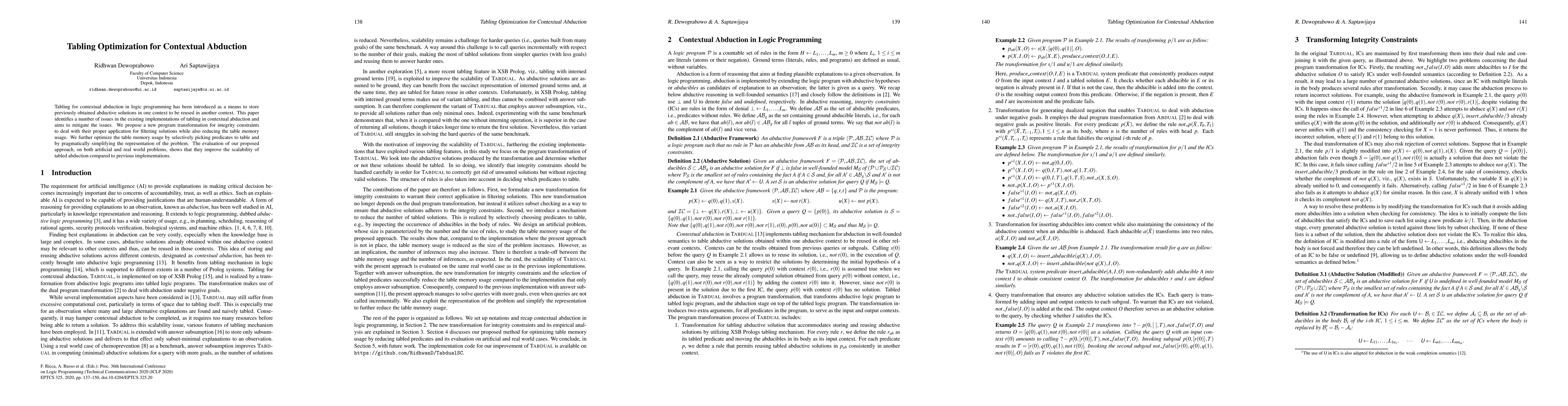 Tabling for contextual abduction in logic programming has been introduced as a means to store previously obtained abductive solutions in one context to be reused in another context. This paper identifies a number of issues in the existing implementations of tabling in contextual abduction and aims to mitigate the issues. We propose a new program transformation for integrity constraints to deal with their proper application for filtering solutions while also reducing the table memory usage. We further optimize the table memory usage by selectively picking predicates to table and by pragmatically simplifying the representation of the problem. The evaluation of our proposed approach, on both artificial and real world problems, shows that they improve the scalability of tabled abduction compared to previous implementations.