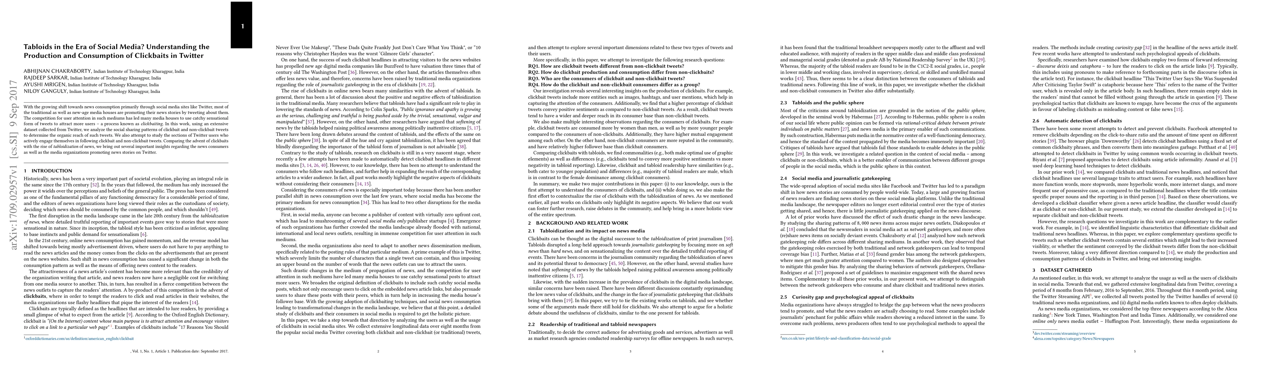 This paper examines the production and consumption of clickbait tweets on Twitter, analyzing their social sharing patterns and organic reach. It compares the rise of clickbaiting to tabloid journalism, revealing insights into news consumers and media organizations' strategies in the social media era.