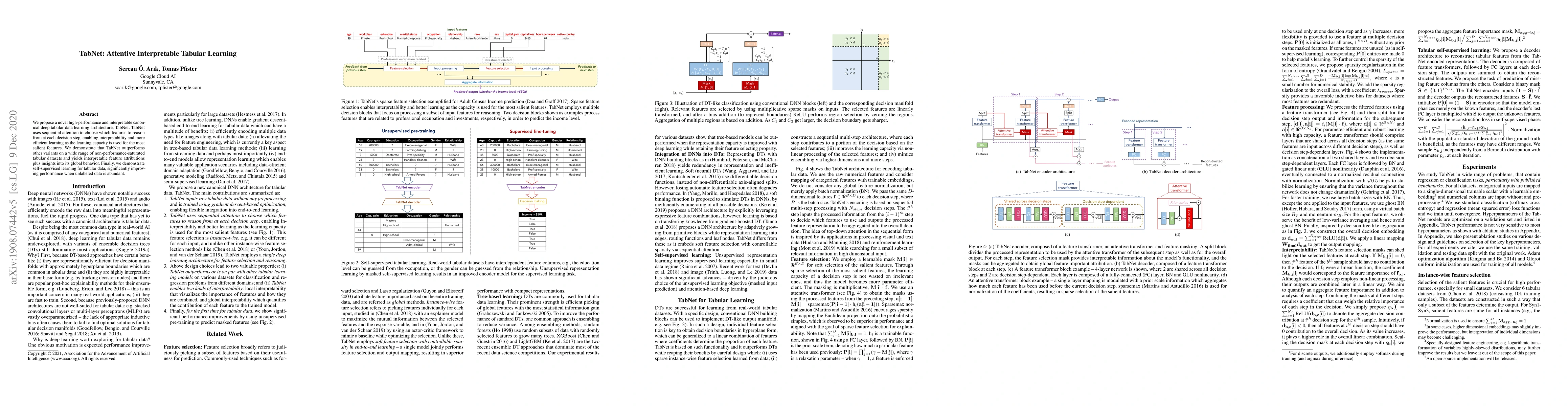 TabNet is a novel, high-performance, and interpretable deep learning architecture for tabular data that leverages sequential attention to focus on salient features, outperforming other models and providing interpretable feature attributions. It also introduces self-supervised learning for tabular data, enhancing performance with unlabeled data.