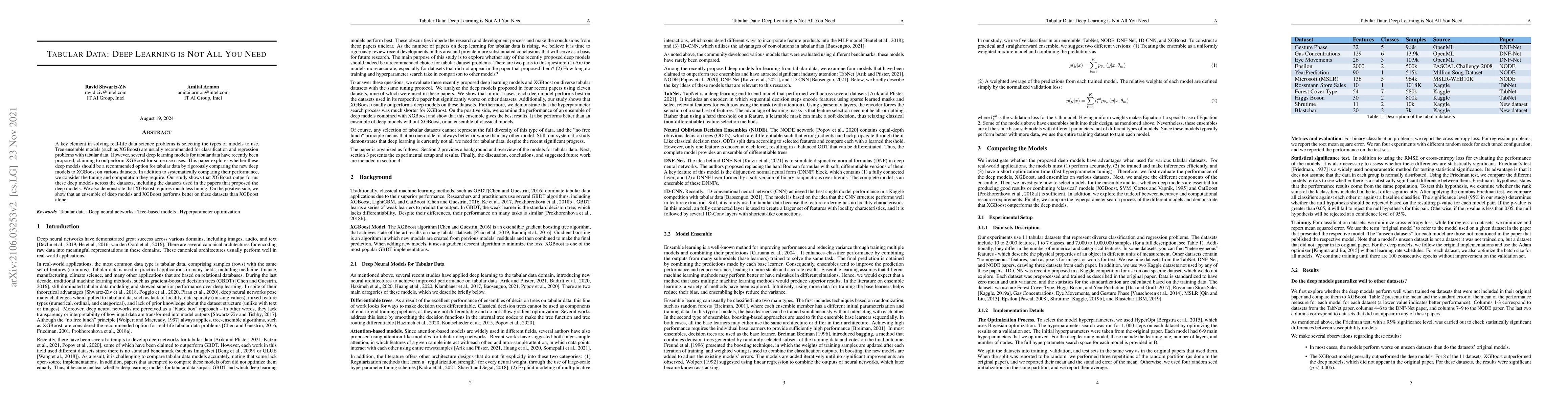 This paper compares the performance of deep learning models to XGBoost for tabular data, finding that XGBoost generally outperforms deep models in terms of both accuracy and ease of tuning, while an ensemble combining both methods yields the best results.