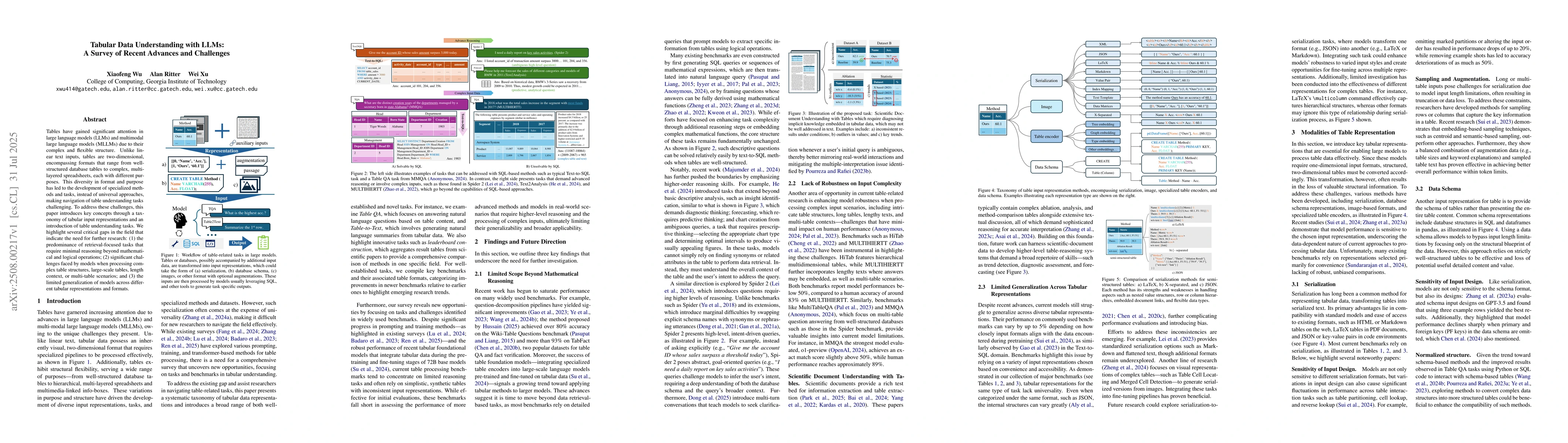 Tables have gained significant attention in large language models (LLMs) and multimodal large language models (MLLMs) due to their complex and flexible structure. Unlike linear text inputs, tables are two-dimensional, encompassing formats that range from well-structured database tables to complex, multi-layered spreadsheets, each with different purposes. This diversity in format and purpose has led to the development of specialized methods and tasks, instead of universal approaches, making navigation of table understanding tasks challenging. To address these challenges, this paper introduces key concepts through a taxonomy of tabular input representations and an introduction of table understanding tasks. We highlight several critical gaps in the field that indicate the need for further research: (1) the predominance of retrieval-focused tasks that require minimal reasoning beyond mathematical and logical operations; (2) significant challenges faced by models when processing complex table structures, large-scale tables, length context, or multi-table scenarios; and (3) the limited generalization of models across different tabular representations and formats.