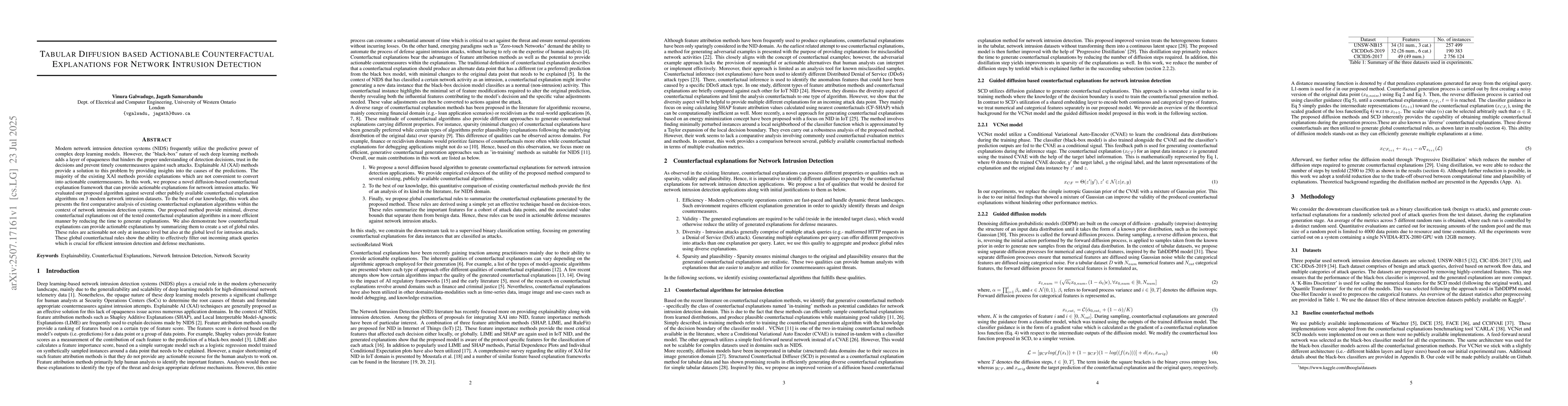 Modern network intrusion detection systems (NIDS) frequently utilize the predictive power of complex deep learning models. However, the "black-box" nature of such deep learning methods adds a layer of opaqueness that hinders the proper understanding of detection decisions, trust in the decisions and prevent timely countermeasures against such attacks. Explainable AI (XAI) methods provide a solution to this problem by providing insights into the causes of the predictions. The majority of the existing XAI methods provide explanations which are not convenient to convert into actionable countermeasures. In this work, we propose a novel diffusion-based counterfactual explanation framework that can provide actionable explanations for network intrusion attacks. We evaluated our proposed algorithm against several other publicly available counterfactual explanation algorithms on 3 modern network intrusion datasets. To the best of our knowledge, this work also presents the first comparative analysis of existing counterfactual explanation algorithms within the context of network intrusion detection systems. Our proposed method provide minimal, diverse counterfactual explanations out of the tested counterfactual explanation algorithms in a more efficient manner by reducing the time to generate explanations. We also demonstrate how counterfactual explanations can provide actionable explanations by summarizing them to create a set of global rules. These rules are actionable not only at instance level but also at the global level for intrusion attacks. These global counterfactual rules show the ability to effectively filter out incoming attack queries which is crucial for efficient intrusion detection and defense mechanisms.