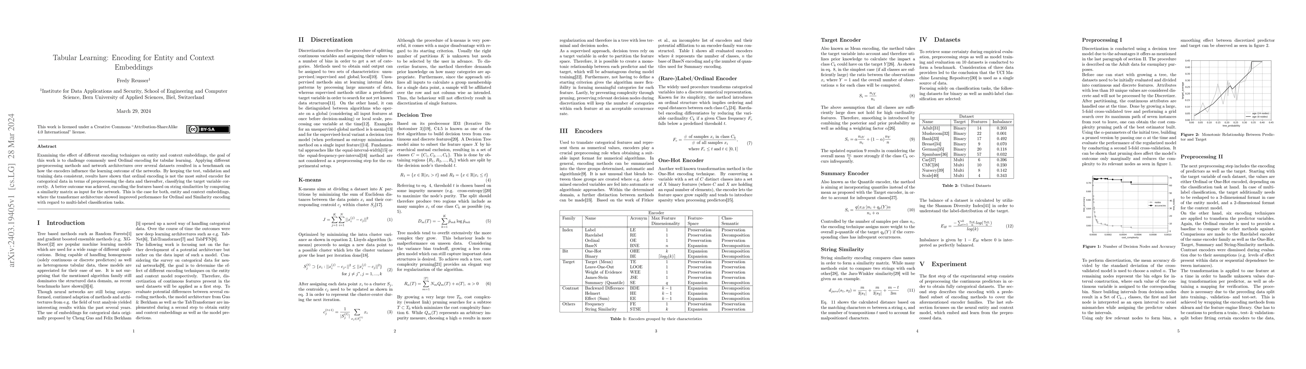 This paper investigates various encoding techniques for entity and context embeddings in tabular learning, demonstrating that ordinal encoding is not optimal. Using multiple datasets and network architectures, the study found that encoding features based on string similarities via a similarity matrix leads to better classification outcomes, particularly benefiting transformer architectures in multi-label classification tasks.