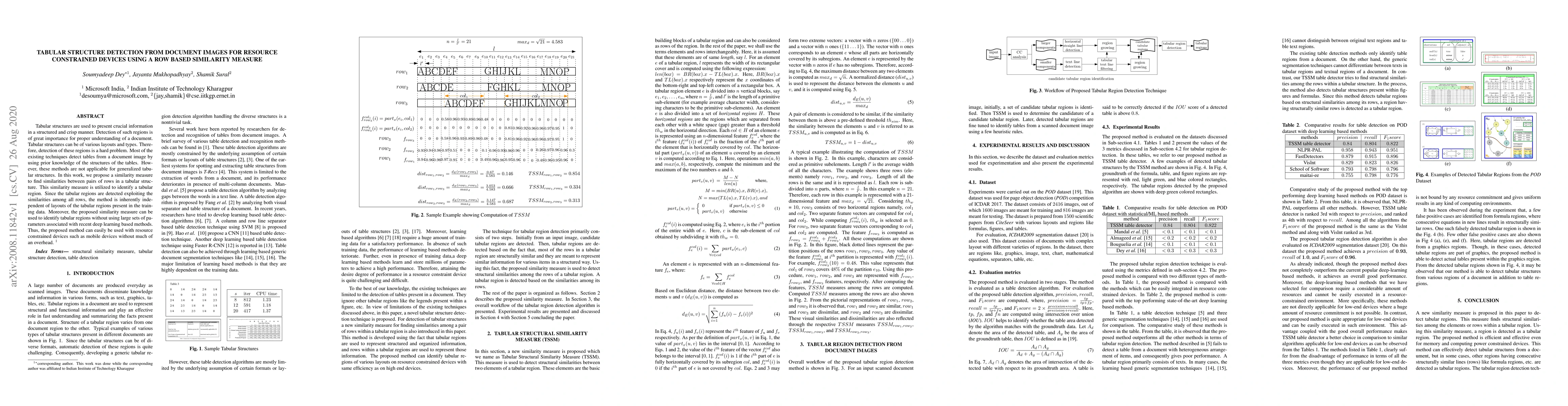 This paper proposes a row-based similarity measure to detect tabular structures in document images, which is layout-independent and requires fewer parameters than deep learning methods, making it suitable for resource-constrained devices like mobile devices. The method identifies tabular regions by exploiting similarities among rows, without relying on prior knowledge of table structures.