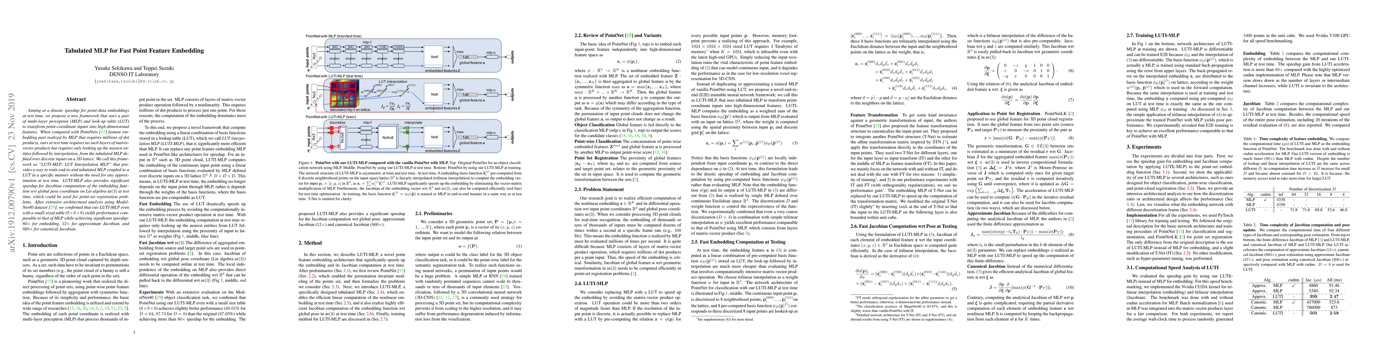 Aiming at a drastic speedup for point-data embeddings at test time, we propose a new framework that uses a pair of multi-layer perceptron (MLP) and look-up table (LUT) to transform point-coordinate inputs into high-dimensional features. When compared with PointNet's feature embedding part realized by MLP that requires millions of dot products, ours at test time requires no such layers of matrix-vector products but requires only looking up the nearest entities followed by interpolation, from the tabulated MLP defined over discrete inputs on a 3D lattice. We call this framework as "LUTI-MLP: LUT Interpolation MLP" that provides a way to train end-to-end tabulated MLP coupled to a LUT in a specific manner without the need for any approximation at test time. LUTI-MLP also provides significant speedup for Jacobian computation of the embedding function wrt global pose coordinate on Lie algebra $\mathfrak{se}(3)$ at test time, which could be used for point-set registration problems. After extensive architectural analysis using ModelNet40 dataset, we confirmed that our LUTI-MLP even with a small-sized table ($8\times 8\times 8$) yields performance comparable to that of MLP while achieving significant speedup: $80\times$ for embedding, $12\times$ for approximate Jacobian, and $860\times$ for canonical Jacobian.