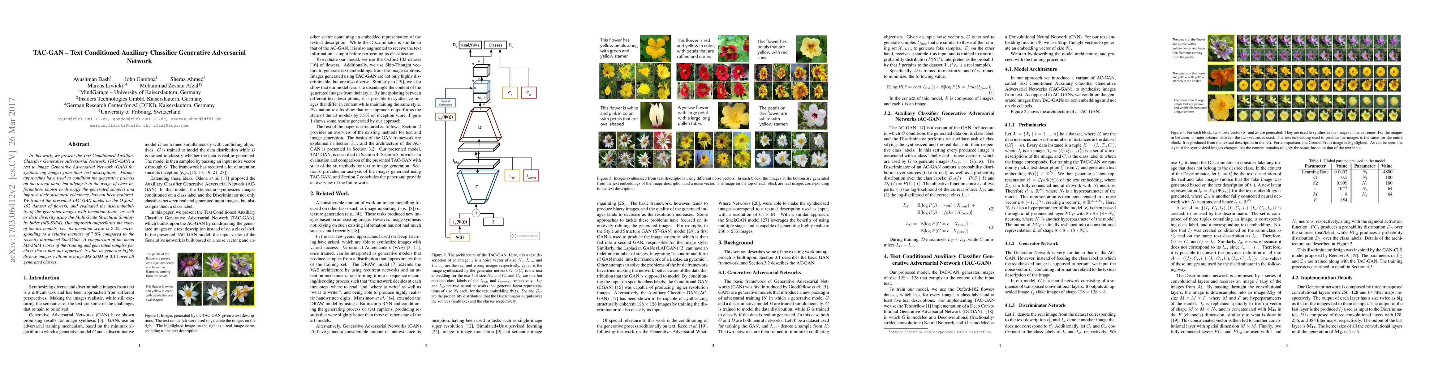 In this work, we present the Text Conditioned Auxiliary Classifier Generative Adversarial Network, (TAC-GAN) a text to image Generative Adversarial Network (GAN) for synthesizing images from their text descriptions. Former approaches have tried to condition the generative process on the textual data; but allying it to the usage of class information, known to diversify the generated samples and improve their structural coherence, has not been explored. We trained the presented TAC-GAN model on the Oxford-102 dataset of flowers, and evaluated the discriminability of the generated images with Inception-Score, as well as their diversity using the Multi-Scale Structural Similarity Index (MS-SSIM). Our approach outperforms the state-of-the-art models, i.e., its inception score is 3.45, corresponding to a relative increase of 7.8% compared to the recently introduced StackGan. A comparison of the mean MS-SSIM scores of the training and generated samples per class shows that our approach is able to generate highly diverse images with an average MS-SSIM of 0.14 over all generated classes.
