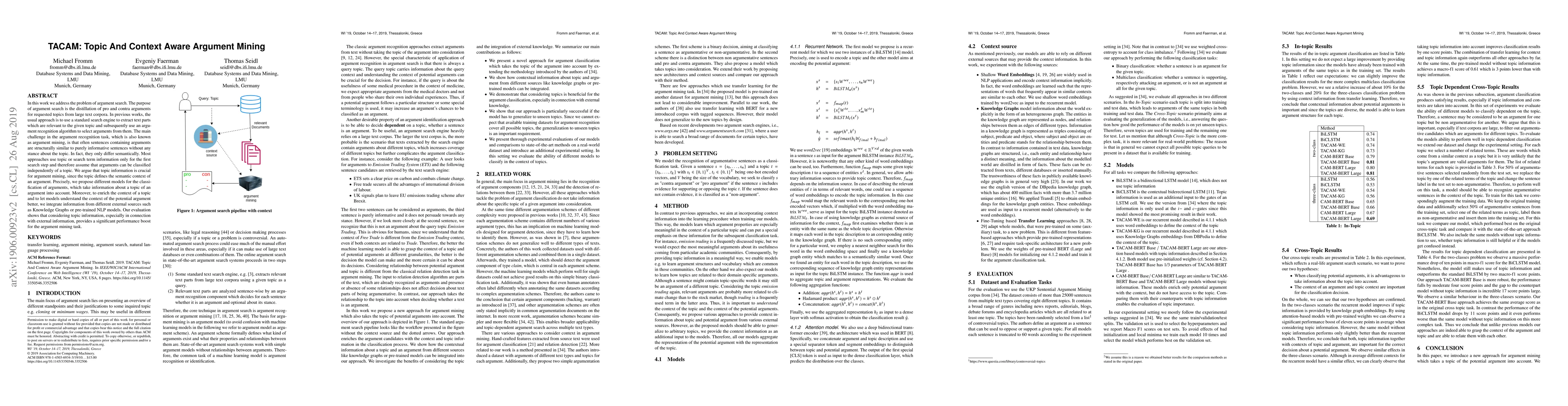 This paper proposes TACAM, a system for Topic And Context Aware Argument Mining, to improve the identification of arguments in large text corpora by incorporating topic-specific context and external information sources. The evaluation demonstrates that this approach significantly enhances argument classification performance.