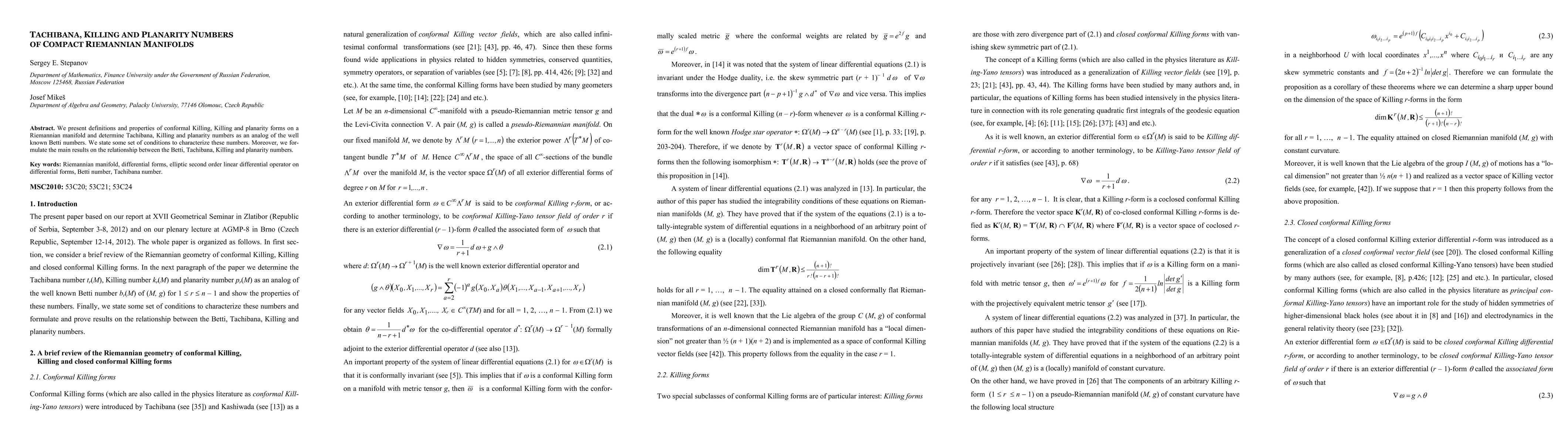 We present definitions and properties of conformal Killing, Killing and planarity forms on a Riemannian manifold and determine Tachibana, Killing and planarity numbers as an analog of the well known Betti numbers. We state some set of conditions to characterize these numbers. Moreover, we formulate the main results on the relationship between the Betti, Tachibana, Killing and planarity numbers.