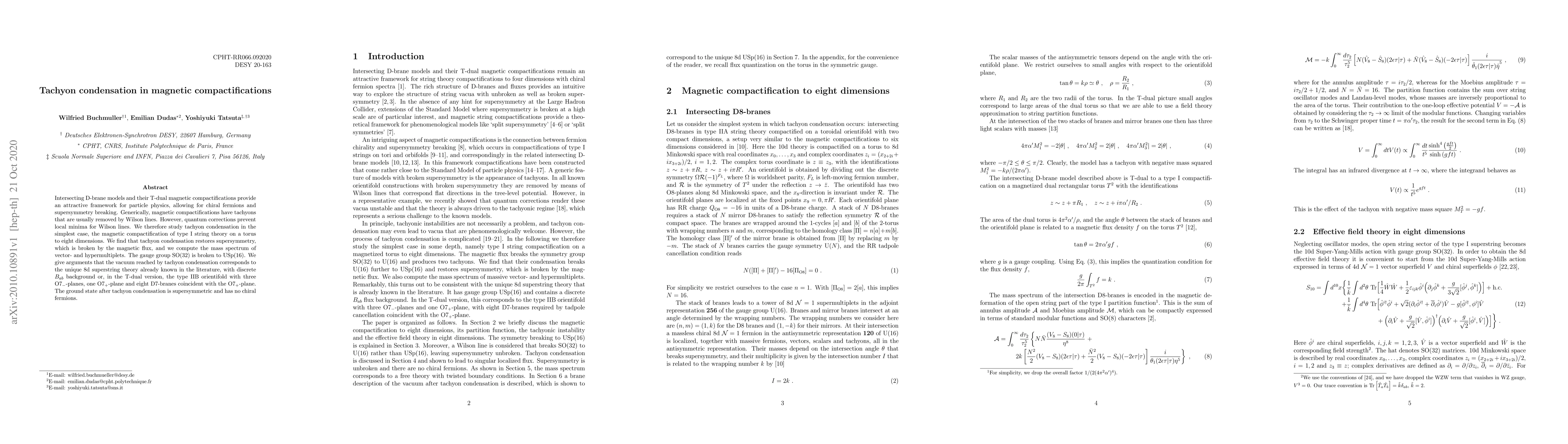 Intersecting D-brane models and their T-dual magnetic compactifications provide an attractive framework for particle physics, allowing for chiral fermions and supersymmetry breaking. Generically, magnetic compactifications have tachyons that are usually removed by Wilson lines. However, quantum corrections prevent local minima for Wilson lines. We therefore study tachyon condensation in the simplest case, the magnetic compactification of type I string theory on a torus to eight dimensions. We find that tachyon condensation restores supersymmetry, which is broken by the magnetic flux, and we compute the mass spectrum of vector- and hypermultiplets. The gauge group $\text{SO}(32)$ is broken to $\text{USp}(16)$. We give arguments that the vacuum reached by tachyon condensation corresponds to the unique 8d superstring theory already known in the literature, with discrete $B_{ab}$ background or, in the T-dual version, the type IIB orientifold with three $\text{O}7_-$-planes, one $\text{O}7_+$-plane and eight D7-branes coincident with the $\text{O}7_+$-plane. The ground state after tachyon condensation is supersymmetric and has no chiral fermions.
