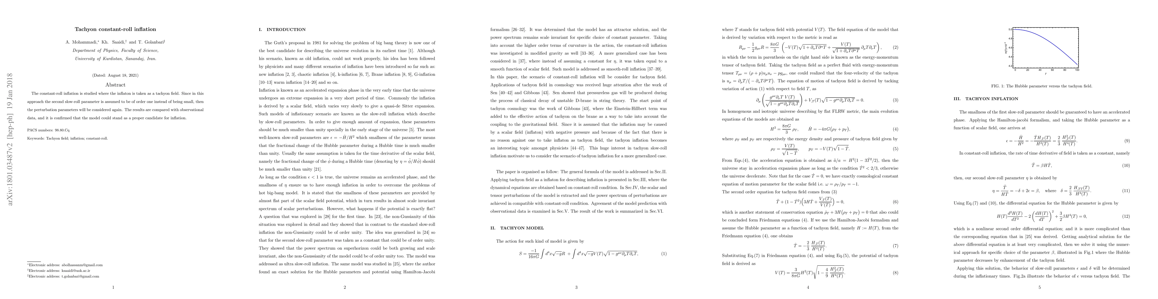The constant-roll inflation is studied where the inflaton is taken as a tachyon field. Since in this approach the second slow-roll parameter is assumed to be of order one instead of being small, then the perturbation parameters will be considered again. The results are compared with observational data, and it is confirmed that the model could stand as a proper candidate for inflation.