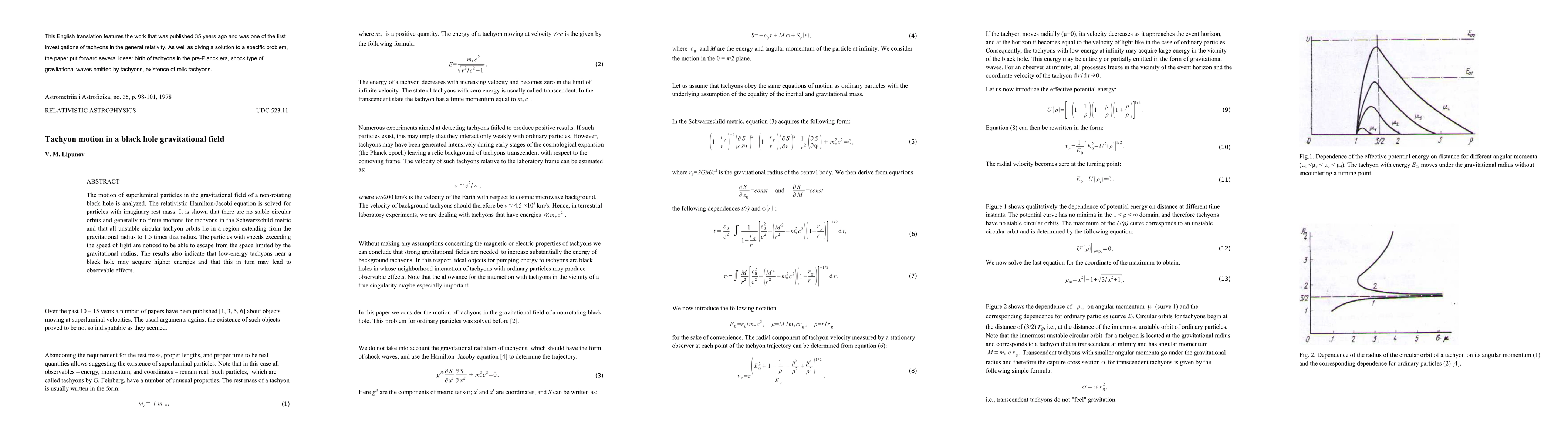 This paper analyzes the motion of tachyons in the gravitational field of a non-rotating black hole, finding that no stable circular orbits exist and all unstable orbits lie within 1.5 times the gravitational radius. Tachyons can escape the gravitational radius and may gain higher energies, potentially leading to observable effects.