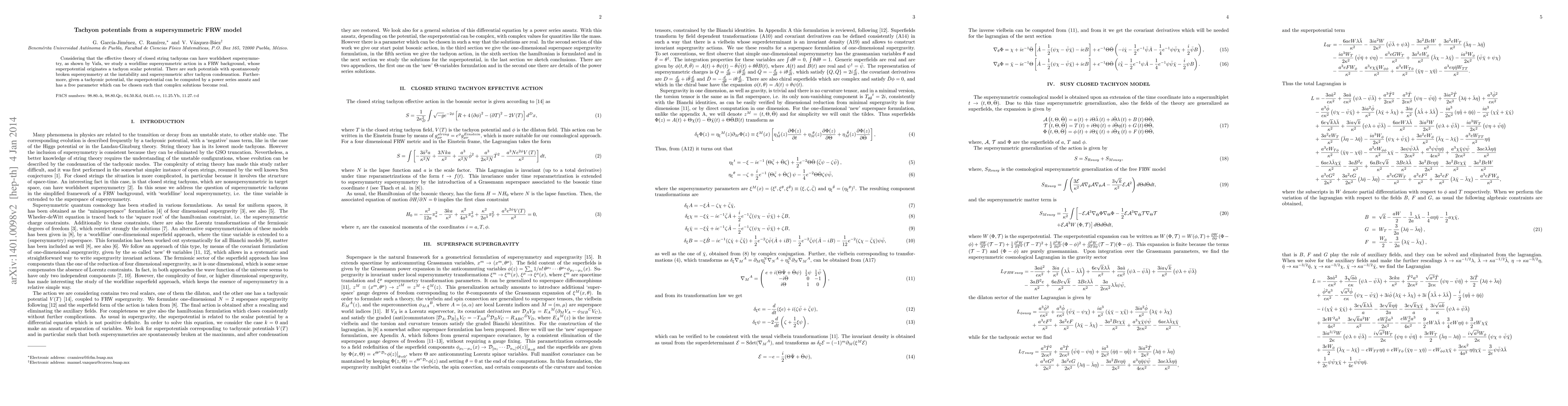 Considering that the effective theory of closed string tachyons can have worldsheet supersymmetry, as shown by Vafa, we study a worldline supersymmetric action in a FRW background, whose superpotential originates a tachyon scalar potential. There are such potentials with spontaneously broken supersymmetry at the instability and supersymmetric after tachyon condensation. Furthermore, given a tachyonic potential, the superpotential can be computed by a power series ansatz and has a free parameter which can be chosen such that complex solutions become real.