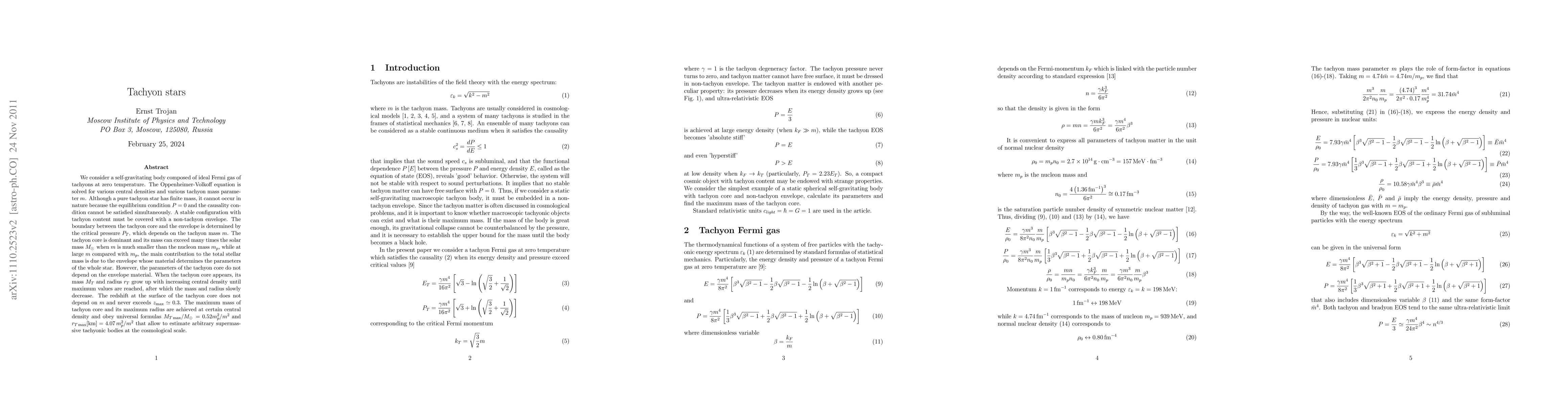 We consider a self-gravitating body composed of ideal Fermi gas of tachyons at zero temperature. The Oppenheimer-Volkoff equation is solved for various central densities and various tachyon mass parameter $m$. Although a pure tachyon star has finite mass, it cannot occur in nature because the equilibrium condition P=0 and the causality condition cannot be satisfied simultaneously. A stable configuration with tachyon content must be covered with a non-tachyon envelope. The boundary between the tachyon core and the envelope is determined by the critical pressure $P_T$, which depends on the tachyon mass $m$. The tachyon core is dominant and its mass can exceed many times the solar mass $M_{\odot}$ when $m$ is much smaller than the nucleon mass $m_p$, while at large $m$ compared with $m_p$, the main contribution to the total stellar mass is due to the envelope whose material determines the parameters of the whole star. However, the parameters of the tachyon core do not depend on the envelope material. When the tachyon core appears, its mass $M_T$ and radius $r_T$ grow up with increasing central density until maximum values are reached, after which the mass and radius slowly decrease. The redshift at the surface of the tachyon core does not depend on $m$ and never exceeds $z_{\max}\simeq 0.3$. The maximum mass of tachyon core and its maximum radius are achieved at certain central density and obey universal formulas $M_{T\max}/M_{\odot}=0.52m_p^2/m^2$ and $r_{T\max}=4.07m_p^2/m^2$ [km] that allow to estimate arbitrary supermassive tachyonic bodies at the cosmological scale.