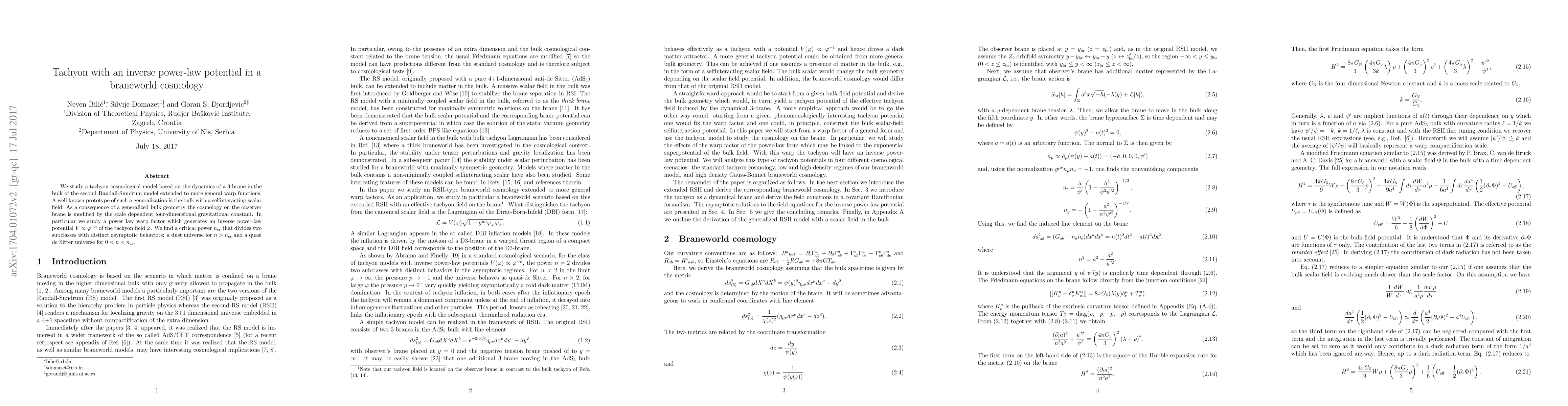 This paper explores a tachyon cosmological model in a braneworld setting based on the Randall-Sundrum model with a generalized warp function, leading to an inverse power-law potential for the tachyon field. It identifies a critical power that distinguishes between a dust-dominated universe and a quasi de Sitter universe.