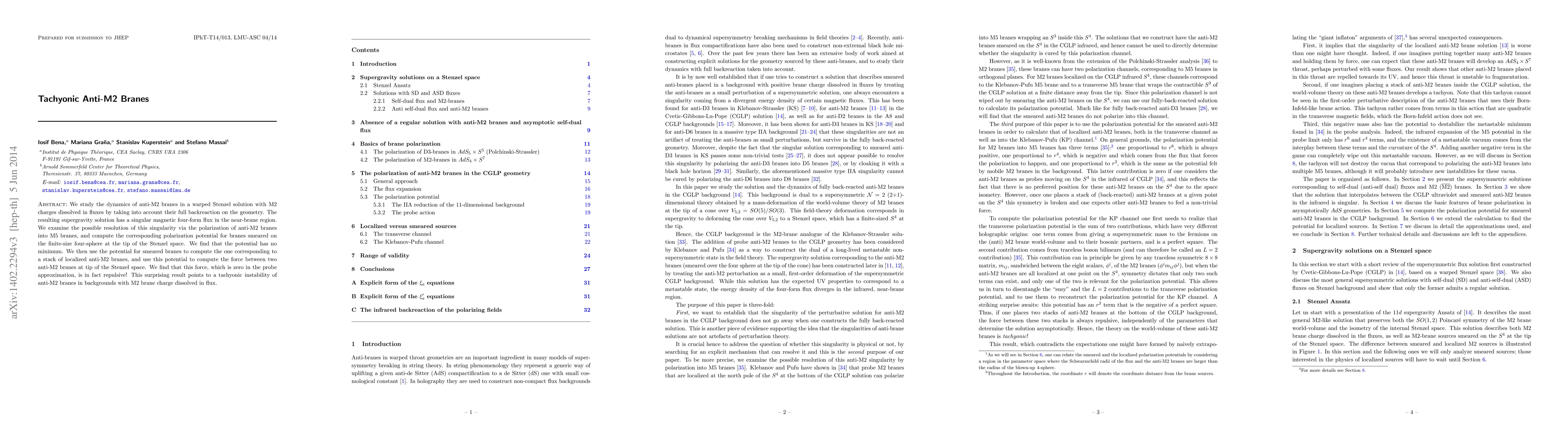 We study the dynamics of anti-M2 branes in a warped Stenzel solution with M2 charges dissolved in fluxes by taking into account their full backreaction on the geometry. The resulting supergravity solution has a singular magnetic four-form flux in the near-brane region. We examine the possible resolution of this singularity via the polarization of anti-M2 branes into M5 branes, and compute the corresponding polarization potential for branes smeared on the finite-size four-sphere at the tip of the Stenzel space. We find that the potential has no minimum. We then use the potential for smeared branes to compute the one corresponding to a stack of localized anti-M2 branes, and use this potential to compute the force between two anti-M2 branes at tip of the Stenzel space. We find that this force, which is zero in the probe approximation, is in fact repulsive. This surprising result points to a tachyonic instability of anti-M2 branes in backgrounds with M2 brane charge dissolved in flux.