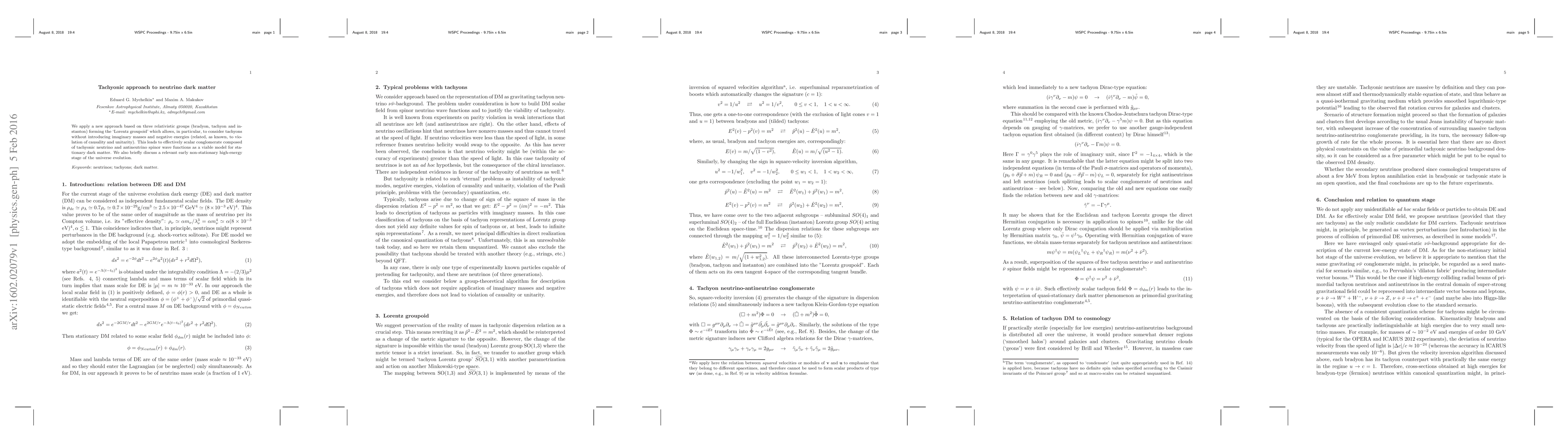 We apply a new approach based on three relativistic groups (bradyon, tachyon and instanton) forming the `Lorentz groupoid' which allows, in particular, to consider tachyons without introducing imaginary masses and negative energies (related, as known, to violation of causality and unitarity). This leads to effectively scalar conglomerate composed of tachyonic neutrino and antineutrino spinor wave functions as a viable model for stationary dark matter. We also briefly discuss a relevant early non-stationary high-energy stage of the universe evolution.