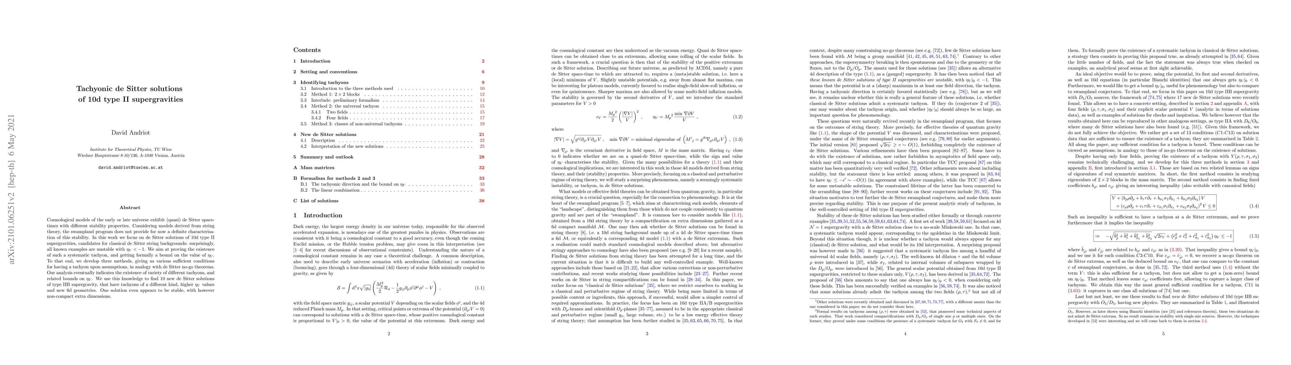 This paper explores de Sitter solutions in 10d type II supergravities, revealing that all known examples exhibit tachyonic instability with $\eta_V < -1$. The authors develop three methods to identify tachyons and establish bounds on $\eta_V$, discovering ten new de Sitter solutions, some with higher $\eta_V$ values and new 6d geometries, including one potentially stable but non-compact solution.
