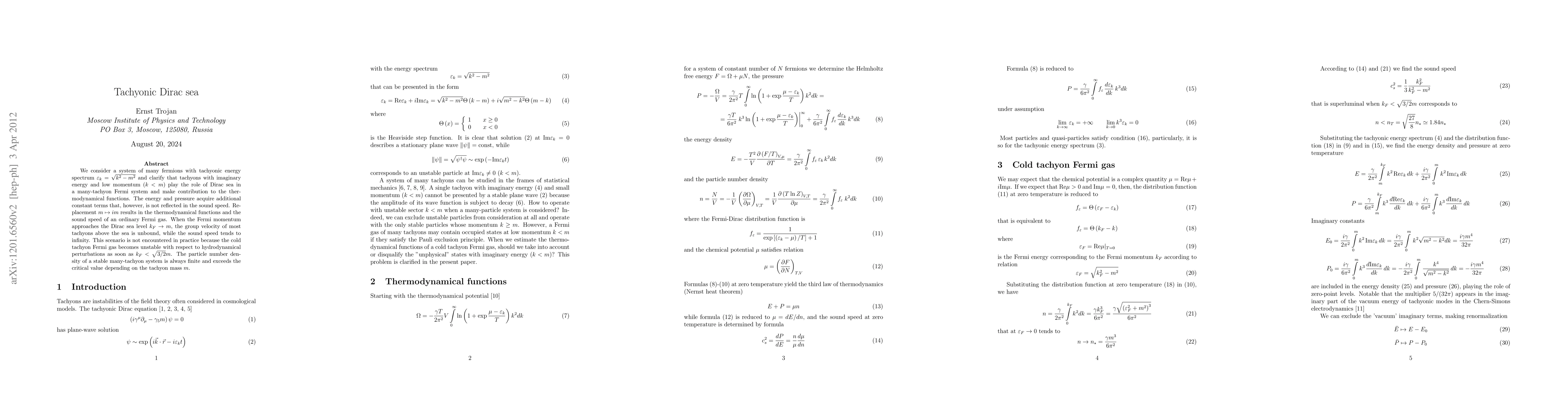 This paper explores a many-fermion system with tachyonic energy spectrum, where tachyons with imaginary energy and low momentum act as a Dirac sea, contributing to thermodynamic functions. The study finds that the system becomes unstable when the Fermi momentum approaches the Dirac sea level, preventing practical realization.