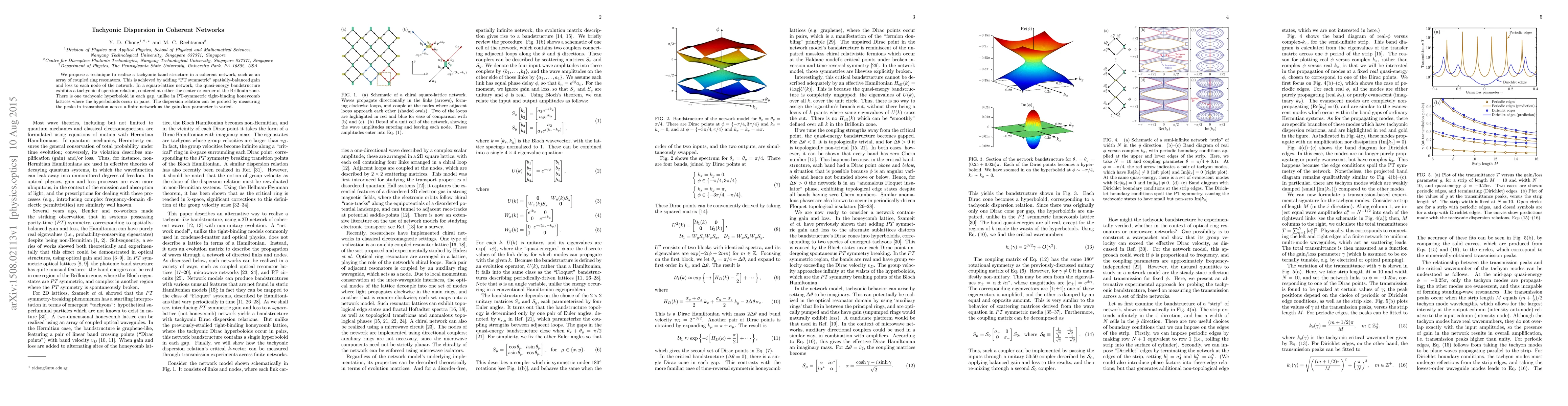 We propose a technique to realize a tachyonic band structure in a coherent network, such as an array of coupled ring resonators. This is achieved by adding "PT symmetric" spatially-balanced gain and loss to each node of the network. In a square-lattice network, the quasi-energy bandstructure exhibits a tachyonic dispersion relation, centered at either the center or corner of the Brillouin zone. There is one tachyonic hyperboloid in each gap, unlike in PT-symmetric tight-binding honeycomb lattices where the hyperboloids occur in pairs. The dispersion relation can be probed by measuring the peaks in transmission across a finite network as the gain/loss parameter is varied.