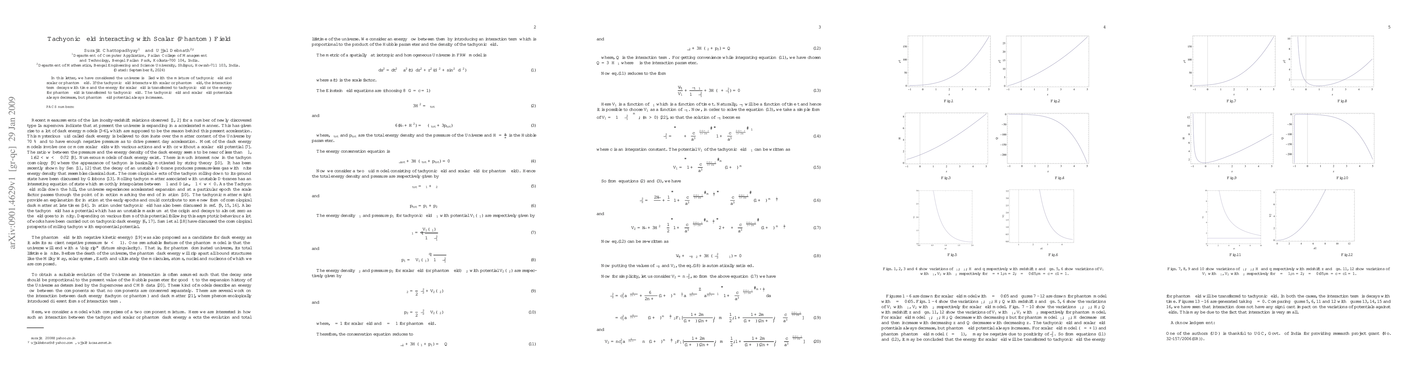 The paper presents a detailed analysis of energy flow between tachyonic and scalar (phantom) fields, deriving equations of motion and examining the behavior of field potentials under interaction.