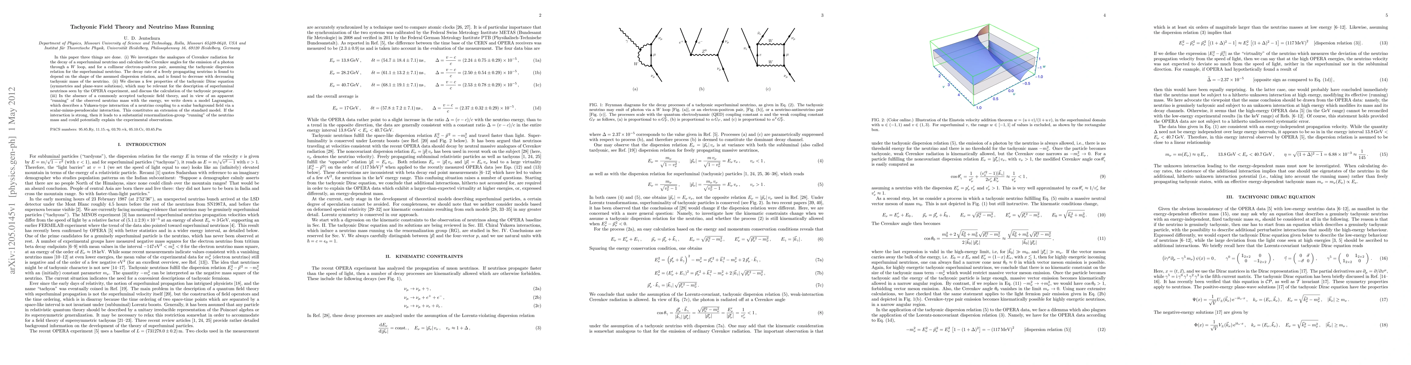 This paper investigates the decay of superluminal neutrinos via Cerenkov radiation and properties of the tachyonic Dirac equation, while proposing a model to explain the observed "running" of neutrino mass through a Yukawa-type interaction with a scalar background field. The decay rate is found to decrease with decreasing tachyonic mass and the model suggests a substantial renormalization-group effect on neutrino mass.