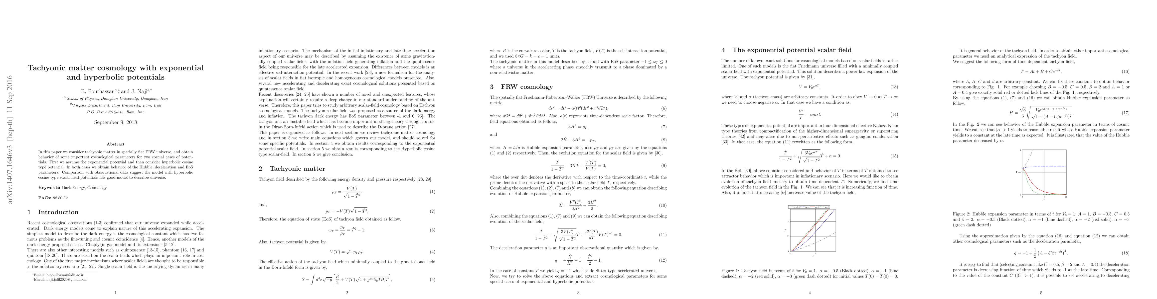 In this paper we consider tachyonic matter in spatially at FRW universe, and obtain behavior of some important cosmological parameters for two special cases of potentials. First we assume the exponential potential and then consider hyperbolic cosine type potential. In both cases we obtain behavior of the Hubble, deceleration and EoS parameters. Comparison with observational data suggest the model with hyperbolic cosine type scalar-field potentials has good model to describe universe.
