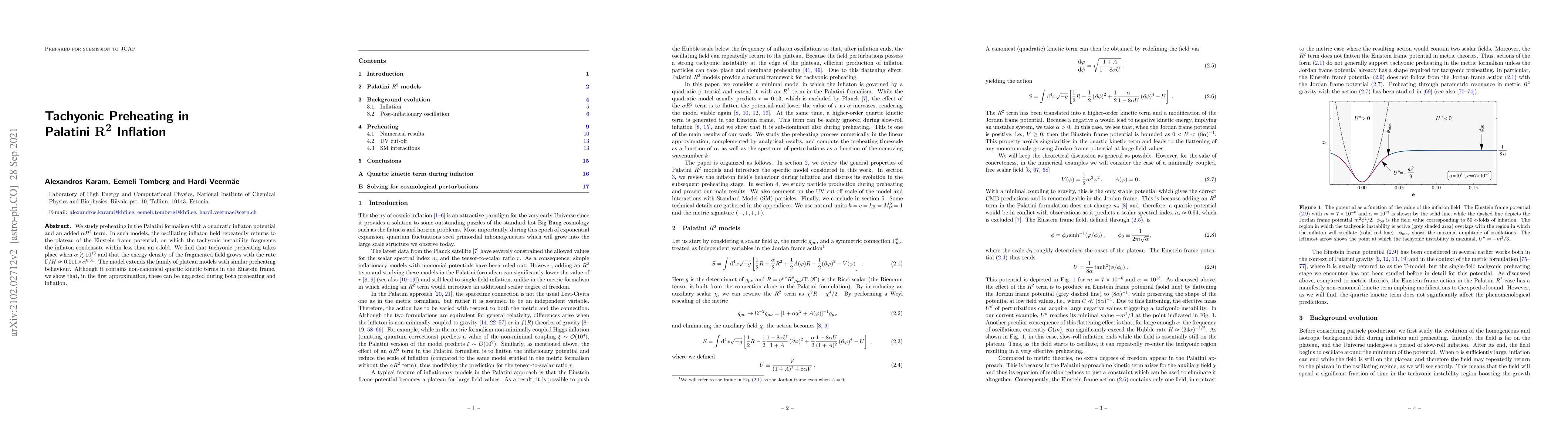 We study preheating in the Palatini formalism with a quadratic inflaton potential and an added $\alpha R^2$ term. In such models, the oscillating inflaton field repeatedly returns to the plateau of the Einstein frame potential, on which the tachyonic instability fragments the inflaton condensate within less than an e-fold. We find that tachyonic preheating takes place when $\alpha \gtrsim 10^{13}$ and that the energy density of the fragmented field grows with the rate $\Gamma/H \approx 0.011 \times \alpha^{0.31}$. The model extends the family of plateau models with similar preheating behaviour. Although it contains non-canonical quartic kinetic terms in the Einstein frame, we show that, in the first approximation, these can be neglected during both preheating and inflation.