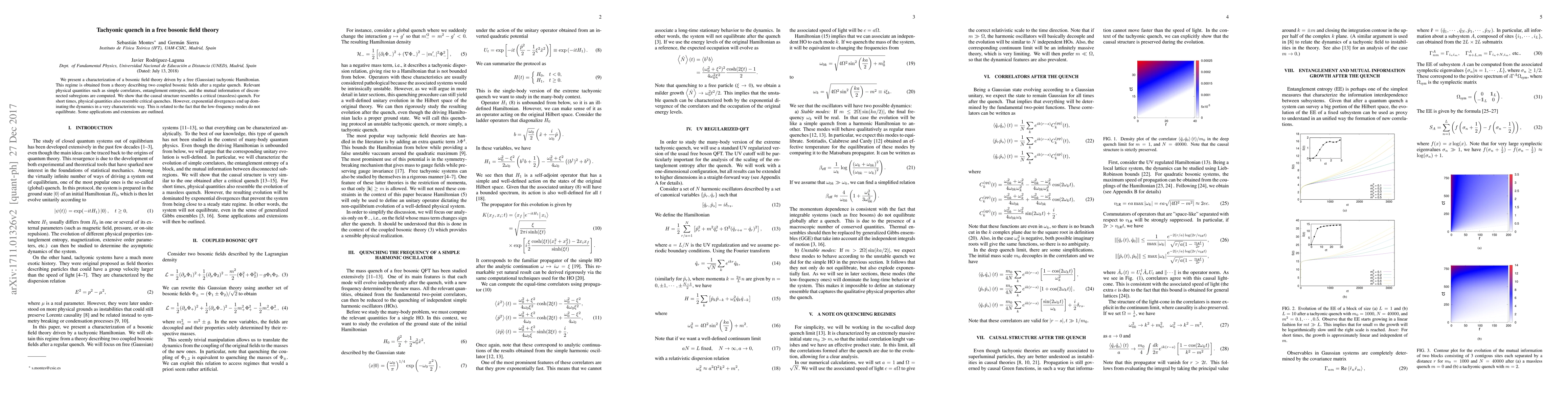We present a characterization of a bosonic field theory driven by a free (Gaussian) tachyonic Hamiltonian. This regime is obtained from a theory describing two coupled bosonic fields after a regular quench. Relevant physical quantities such as simple correlators, entanglement entropies, and the mutual information of disconnected subregions are computed. We show that the causal structure resembles a critical (massless) quench. For short times, physical quantities also resemble critical quenches. However, exponential divergences end up dominating the dynamics in a very characteristic way. This is related to the fact that the low-frequency modes do not equilibrate. Some applications and extensions are outlined.
