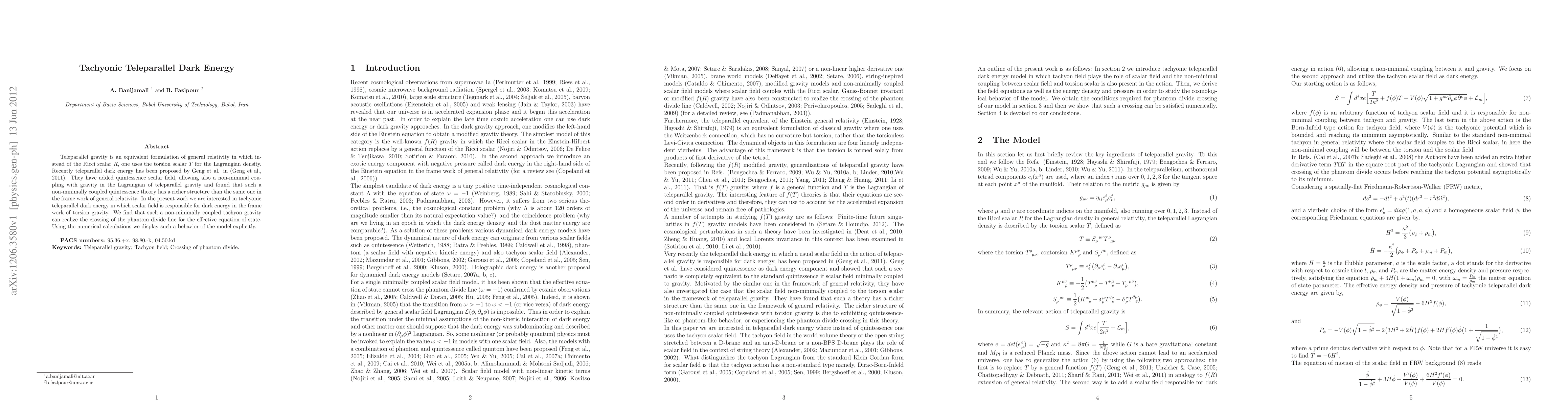 Teleparallel gravity is an equivalent formulation of general relativity in which instead of the Ricci scalar $R$, one uses the torsion scalar $T$ for the Lagrangian density. Recently teleparallel dark energy has been proposed by Geng et al. in (Geng et al., 2011). They have added quintessence scalar field, allowing also a non-minimal coupling with gravity in the Lagrangian of teleparallel gravity and found that such a non-minimally coupled quintessence theory has a richer structure than the same one in the frame work of general relativity. In the present work we are interested in tachyonic teleparallel dark energy in which scalar field is responsible for dark energy in the frame work of torsion gravity. We find that such a non-minimally coupled tachyon gravity can realize the crossing of the phantom divide line for the effective equation of state. Using the numerical calculations we display such a behavior of the model explicitly.