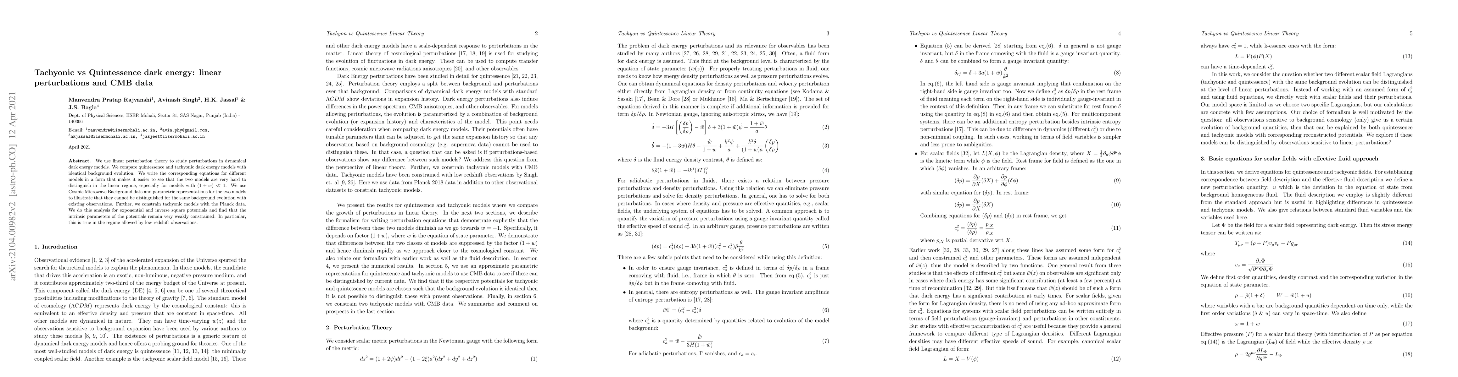 We use linear perturbation theory to study perturbations in dynamical dark energy models. We compare quintessence and tachyonic dark energy models with identical background evolution. We write the corresponding equations for different models in a form that makes it easier to see that the two models are very hard to distinguish in the linear regime, especially for models with $(1 + w) \ll 1$. We use Cosmic Microwave Background data and parametric representations for the two models to illustrate that they cannot be distinguished for the same background evolution with existing observations. Further, we constrain tachyonic models with the Planck data. We do this analysis for exponential and inverse square potentials and find that the intrinsic parameters of the potentials remain very weakly constrained. In particular, this is true in the regime allowed by low redshift observations.