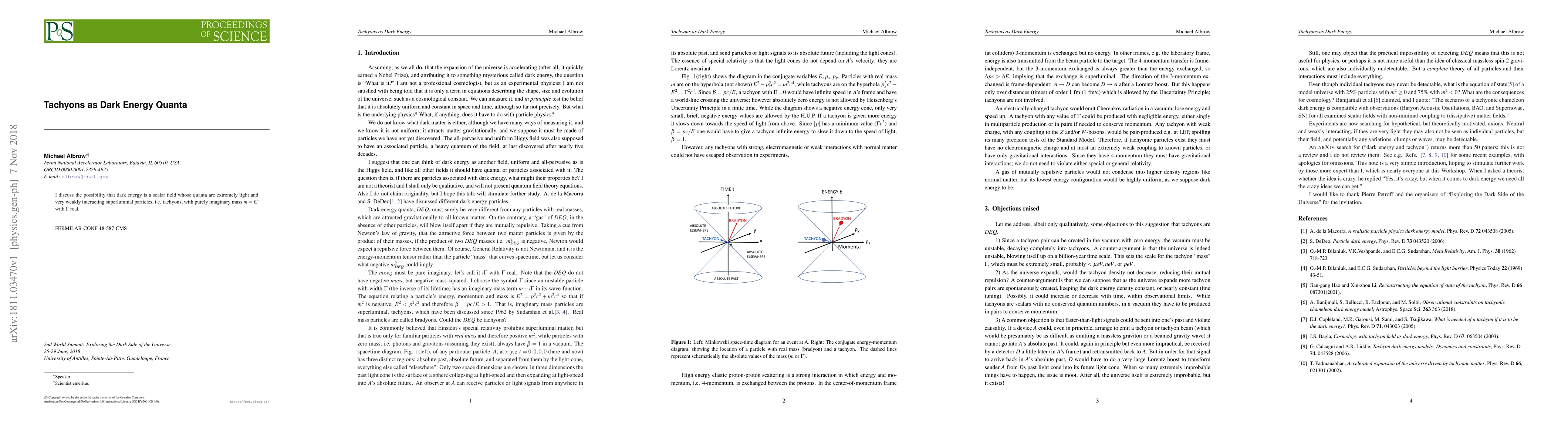 I discuss the possibility that dark energy is a scalar field whose quanta are extremely light and very weakly interacting superluminal particles, i.e. tachyons, with purely imaginary mass $m = i\Gamma$ with $\Gamma$ real.