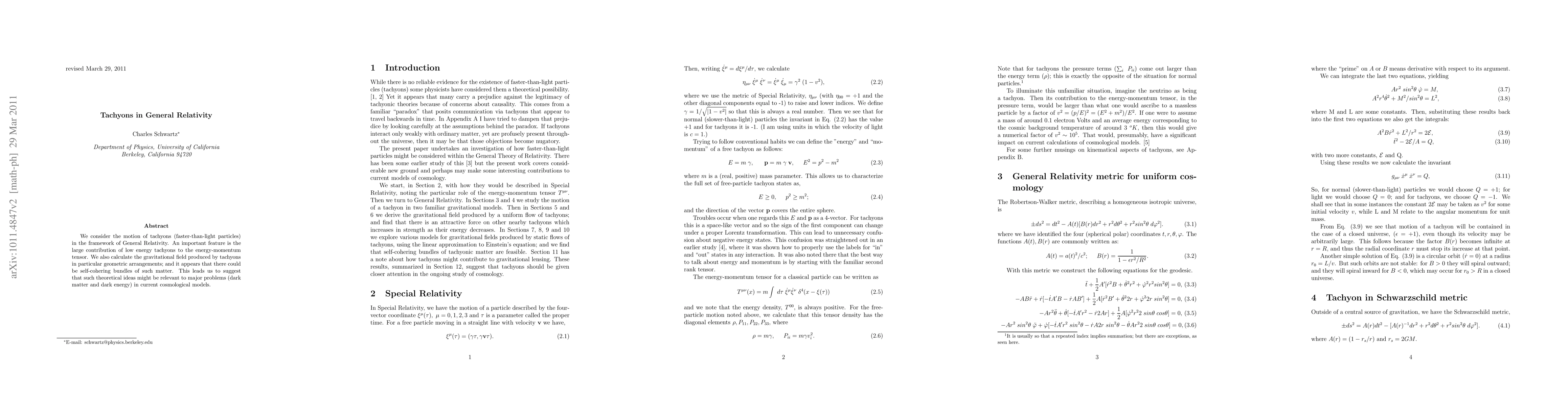 We consider the motion of tachyons (faster-than-light particles) in the framework of General Relativity. An important feature is the large contribution of low energy tachyons to the energy-momentum tensor. We also calculate the gravitational field produced by tachyons in particular geometric arrangements; and it appears that there could be self-cohering bundles of such matter. This leads us to suggest that such theoretical ideas might be relevant to major problems (dark matter and dark energy) in current cosmological models.