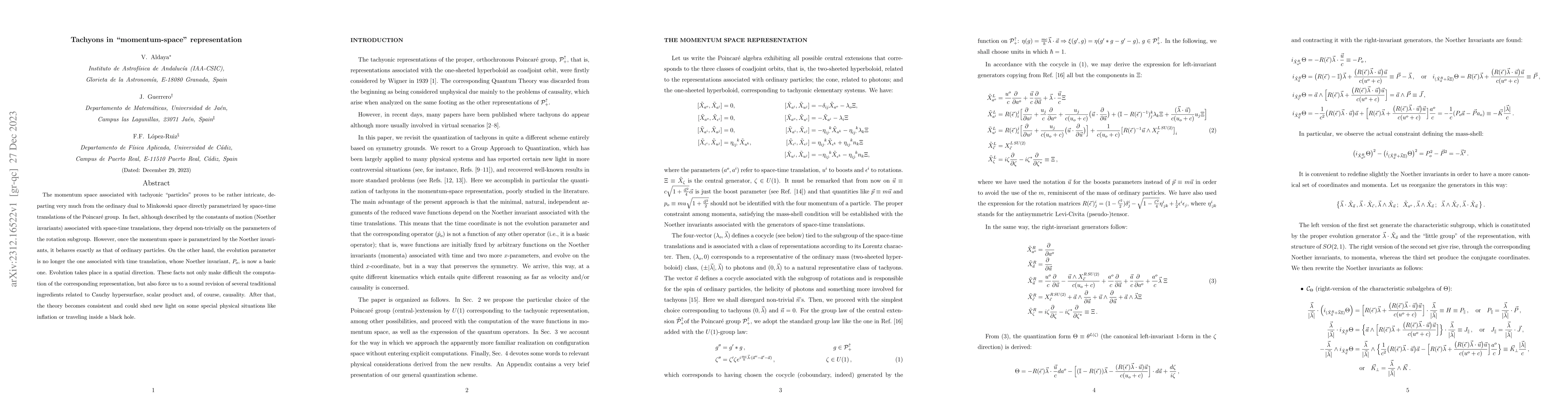 The momentum space associated with "tachyonic particles" proves to be rather intricate, departing very much from the ordinary dual to Minkowski space directly parametrized by space-time translations of the Poincar\'e group. In fact, although described by the constants of motion (Noether invariants) associated with space-time translations, they depend non-trivially on the parameters of the rotation subgroup. However, once the momentum space is parametrized by the Noether invariants, it behaves exactly as that of ordinary particles. On the other hand, the evolution parameter is no longer the one associated with time translation, whose Noether invariant, $P_o$, is now a basic one. Evolution takes place in a spatial direction. These facts not only make difficult the computation of the corresponding representation, but also force us to a sound revision of several traditional ingredients related to Cauchy hypersurface, scalar product and, of course, causality. After that, the theory becomes consistent and could shed new light on some special physical situations like inflation or traveling inside a black hole.