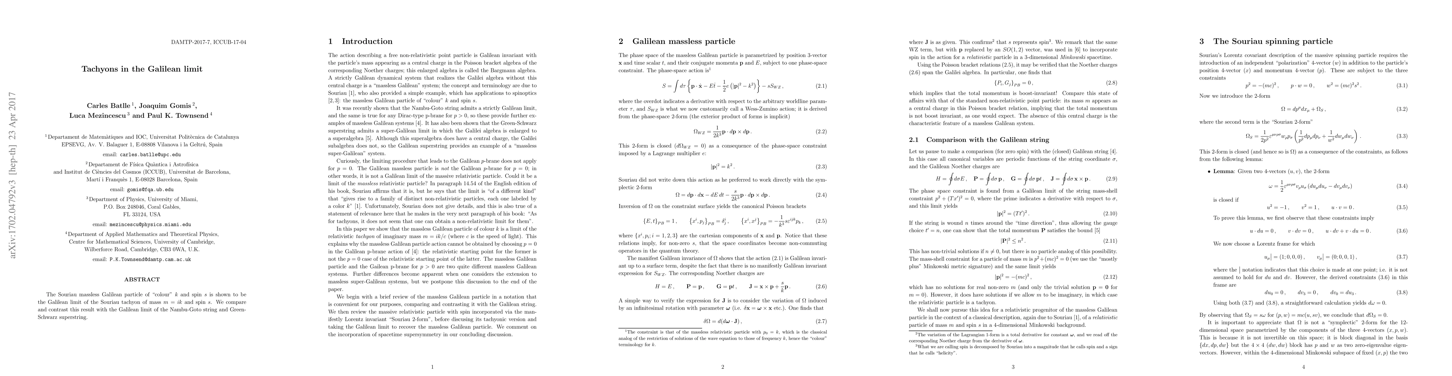 This paper demonstrates that the Souriau massless Galilean particle with "colour" $k$ and spin $s$ emerges as the Galilean limit of the Souriau tachyon with mass $m = ik$ and spin $s$, and it draws comparisons with the Galilean limits of the Nambu-Goto string and the Green-Schwarz superstring.